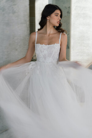 Look no further for modern romance than the Pansy Gown. A full, yet graceful tulle skirt spills down from an expertly constructed bodice that includes boning to sculpt your figure. The square neckline and playful triangle cutouts in the side seams turn into a low-cut square open back, and the whole look is finished with delicate metallic beading and statement flower appliques.