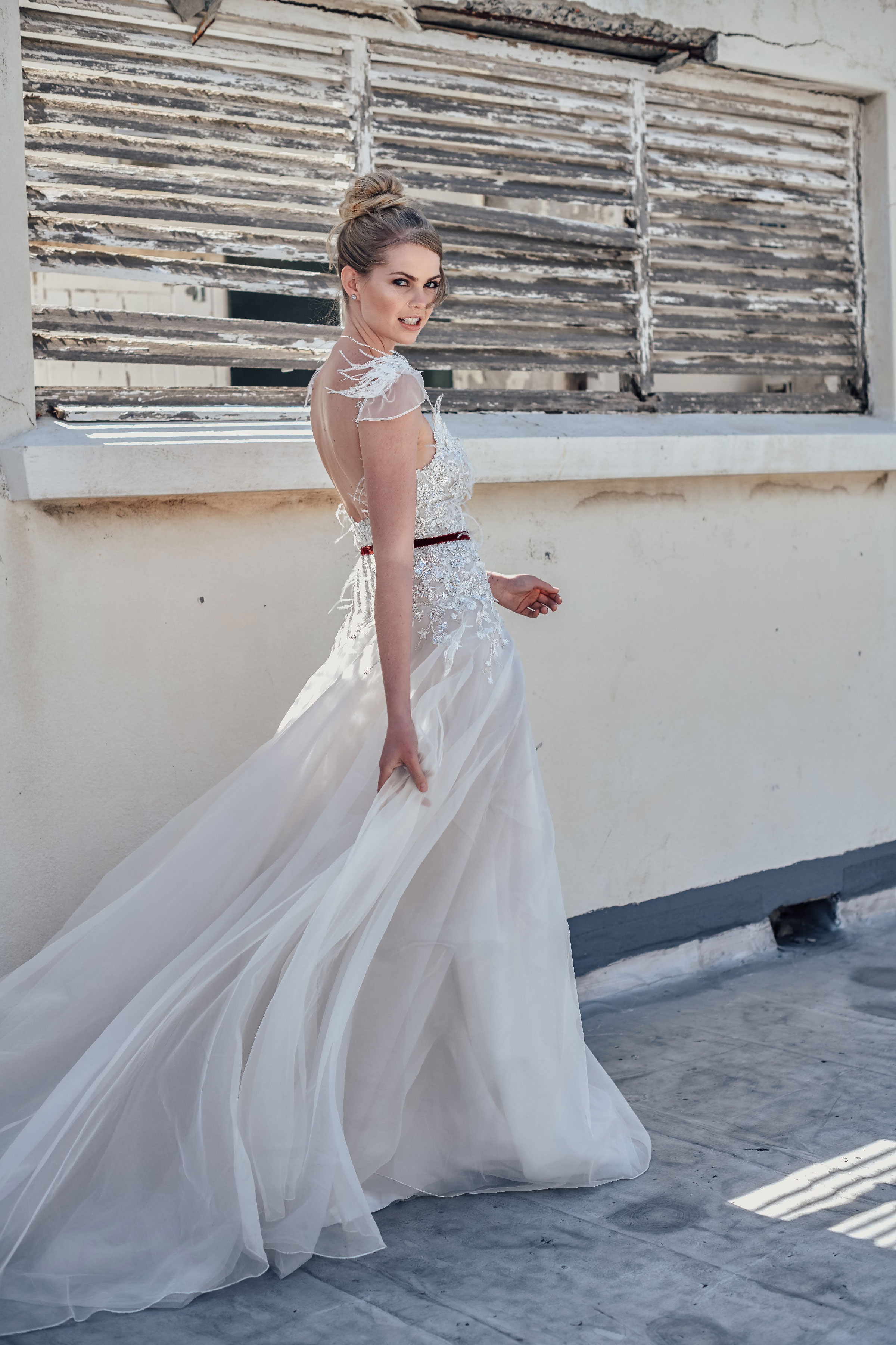 Touches of gold and pink beading and sequins lead up to soft cap sleeves with Ostrich-feather embellishments. And if you’re still looking for a touch of something striking, a velvet ruby ribbon tied around the waist will finish off the look.