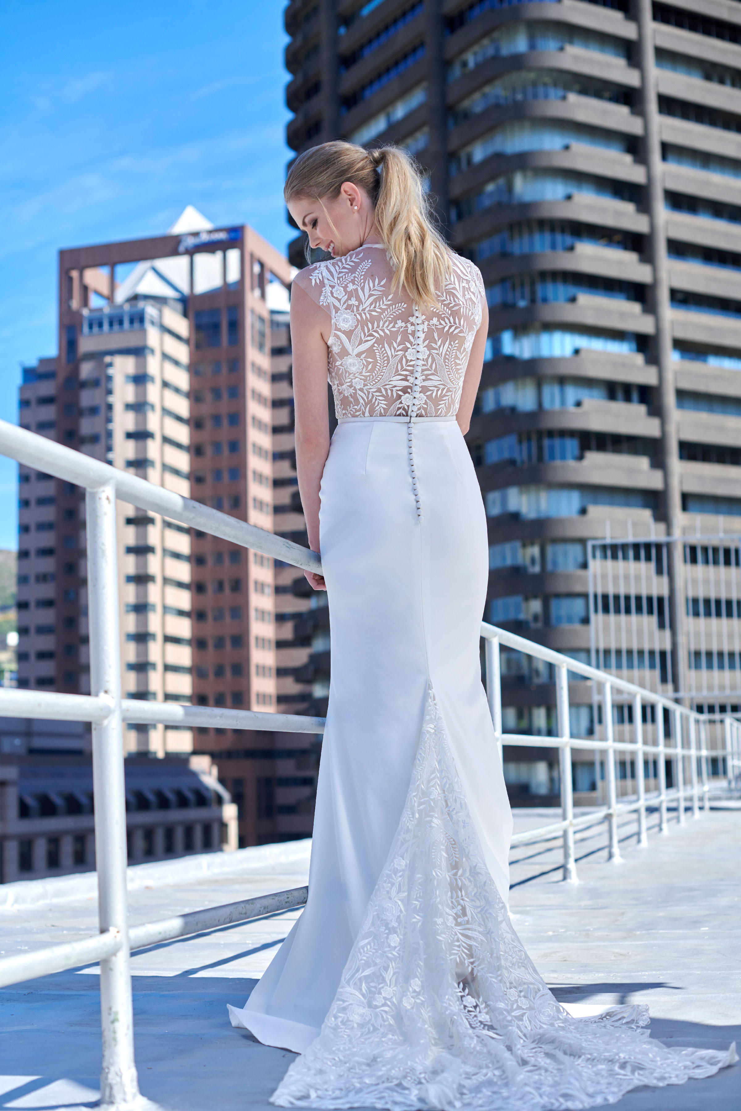 The Viola Gown features a unique polo neckline for a modern take on Victorian style. A floral lace bodice is paired with a simple yet elegant white satin skirt that moves with you, and the floral lace train will make a dramatic impact from behind.