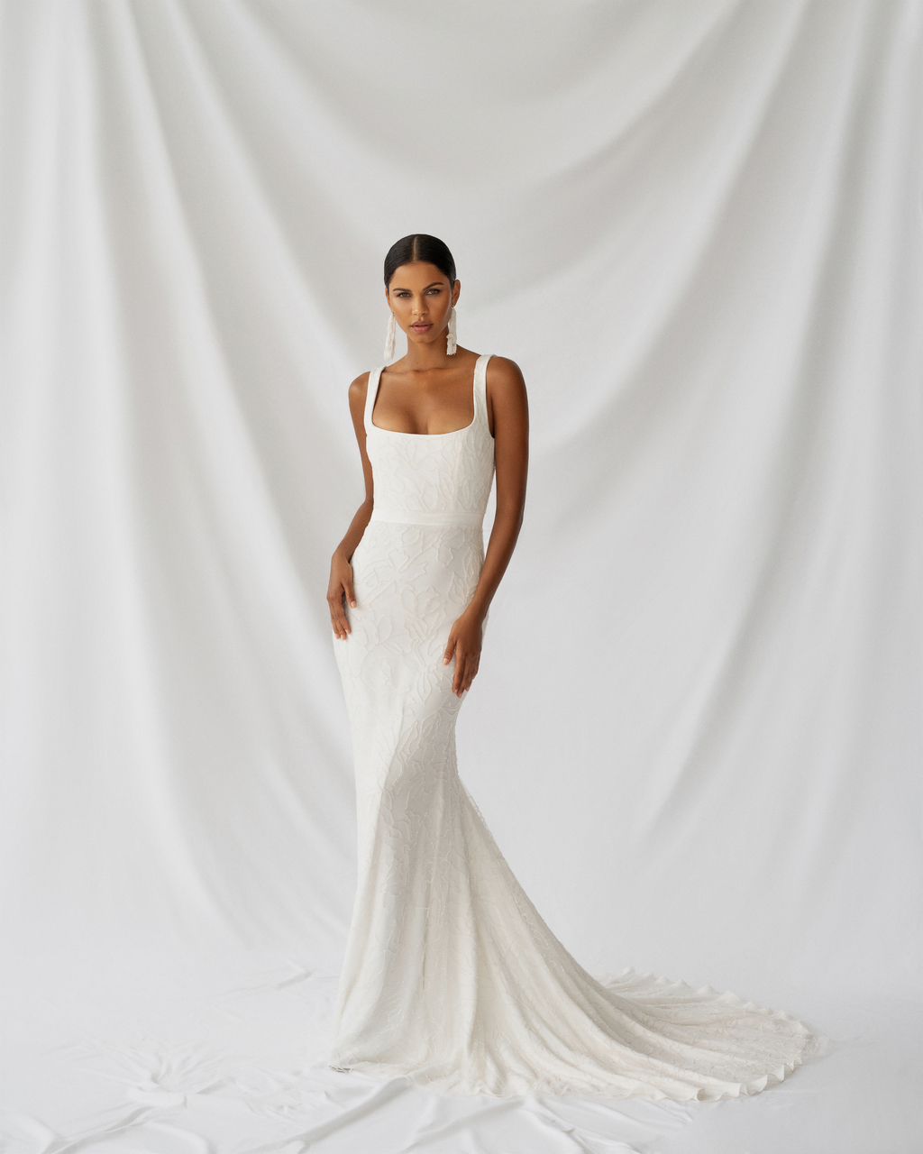 Body: hand-embroidered Italian illusion tulle with boning in bodice