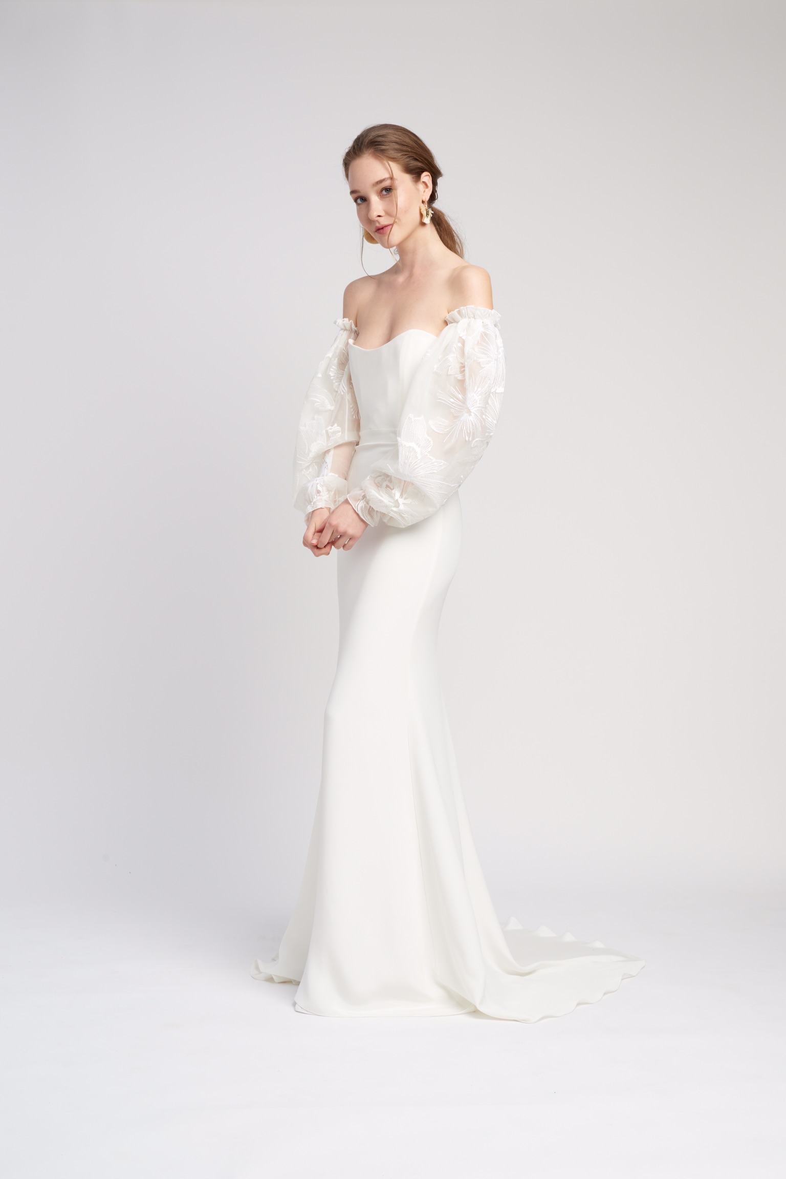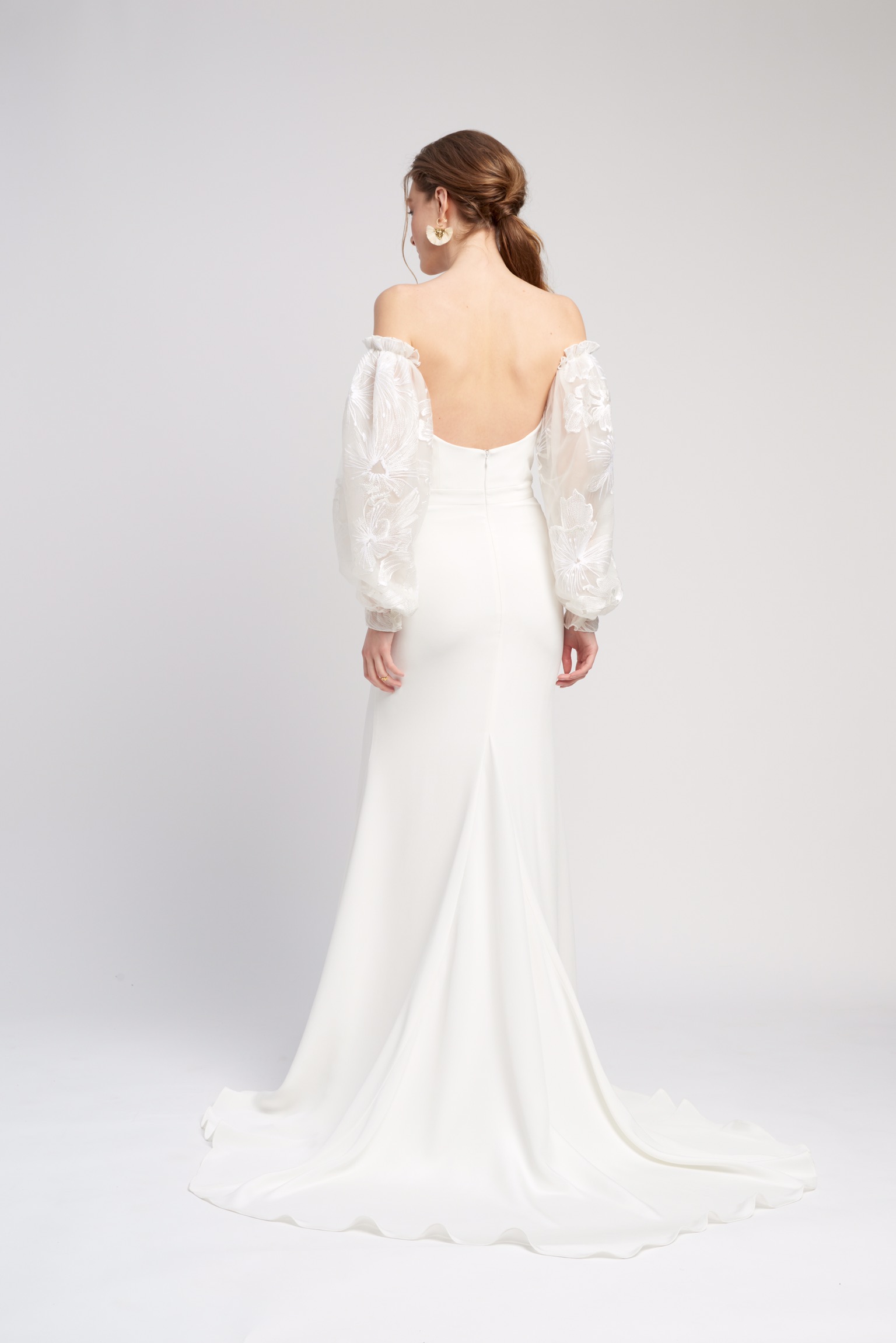 Reine is a show stopper, plain and simple. The exaggerated bishop sleeve in a bold print creates audacious drama. Remove the sleeve, and you have a sleek silk crepe gown with a modern, structured neckline. Reine brings the drama in the coolest way, and you’ll want to dance all night long in this versatile look. Available in off white.