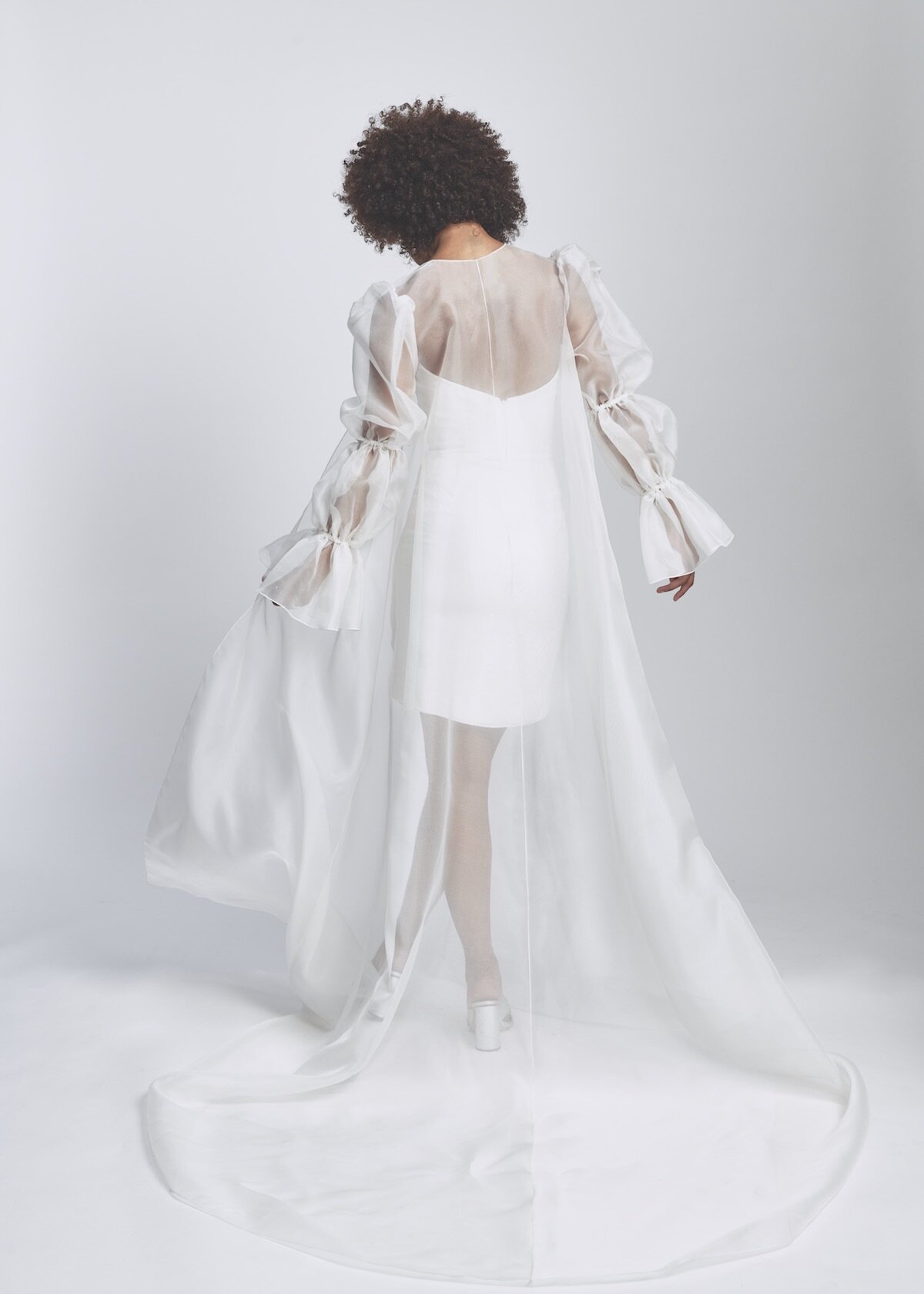 The statement sleeves on our Lilith Jacket make every girl swoon. This 100% silk organza jacket allows for incredible movement; it’ll be hard for anyone to take their eyes off of you. Shown here with our Freya Mini, Lilith pairs well with all of our silk crepe gowns. Available in Off White.