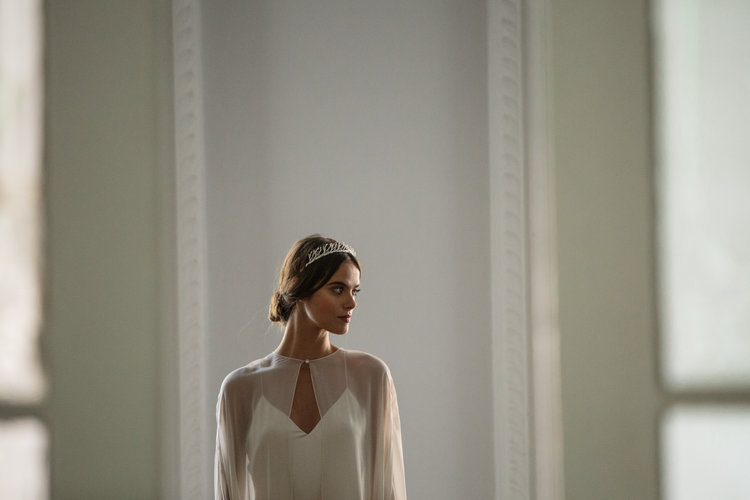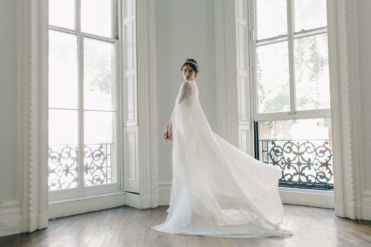 The Annika Cape is a dramatic piece made of 100% silk chiffon. The delicate line of the shoulder seams create the perfect shape, while the slits at the forearm allow for effortless movement. With a single button closure at the neck, this striking cape is sure to make a statement. Available in Off White or Ivory.