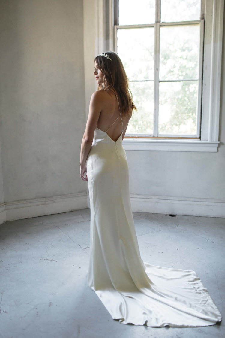The Astrid is a slinky, silk slip gown with an old hollywood vibe. The delicate cross back straps and plunging back keep this sheath feeling modern and fresh. This gown is 100% silk charmeuse and pairs beautifully with our Annika Cape. Available in Off White, Ivory, Champagne, or Dove Grey.