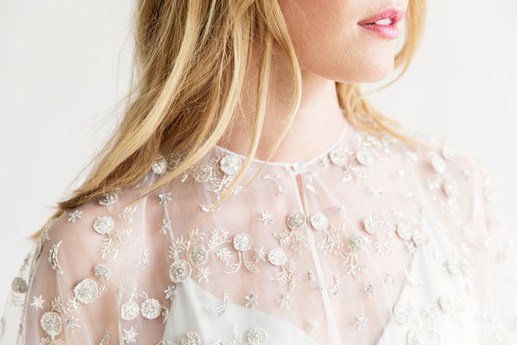 The Luna Cape is truly divine. The delicate celestial beadwork is subtle, yet striking, and adds just the right amount of whimsy to our sleek Astrid Slip Gown, shown here. Slits at the forearm allow for effortless movement, and the single button closure at the neck seamlessly completes this dramatic tulle cape. Luna is available with Silver or Ivory embroidery.
