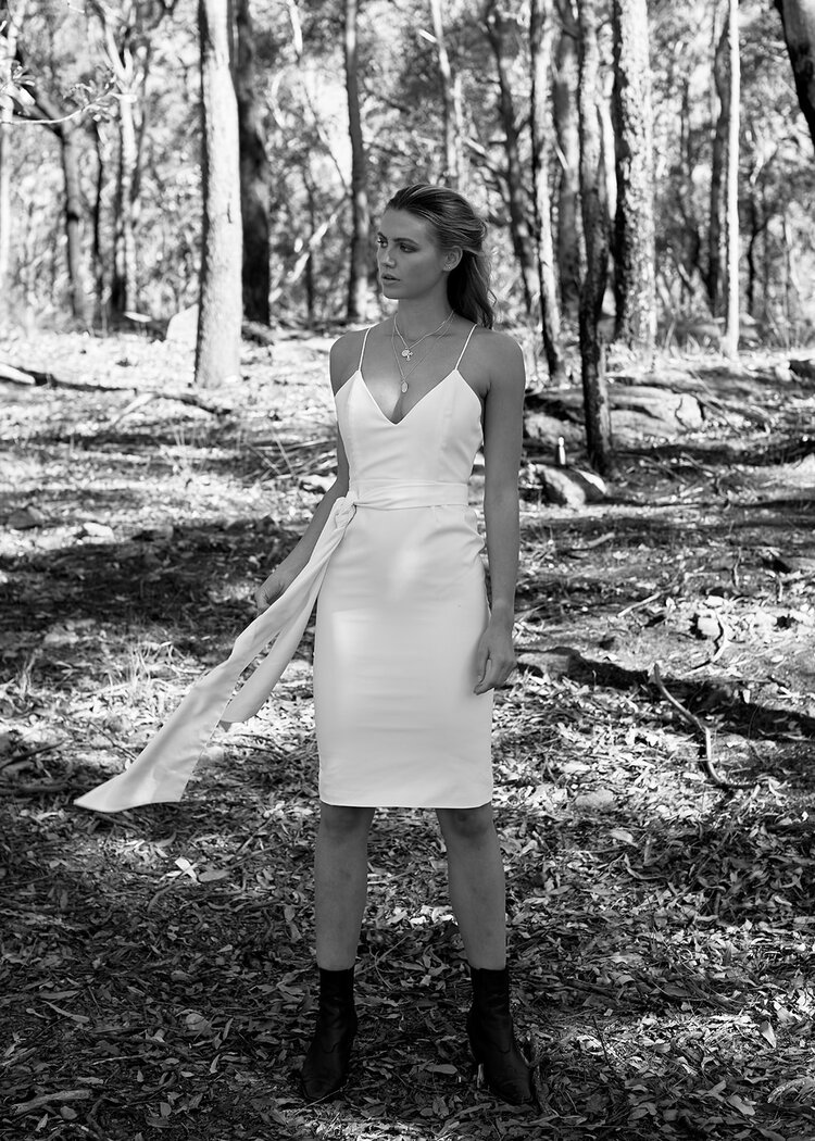 Our first mini dress that’s perfect for a civil ceremony, the NAT crepe dress features a structured bodice with cups and boning, an open back, a beautifully fitted skirt and a long waist tie to add some drama. Style it with a cool coat or some statement shoes, and you’ve got a fuss free look that’s totally timeless.