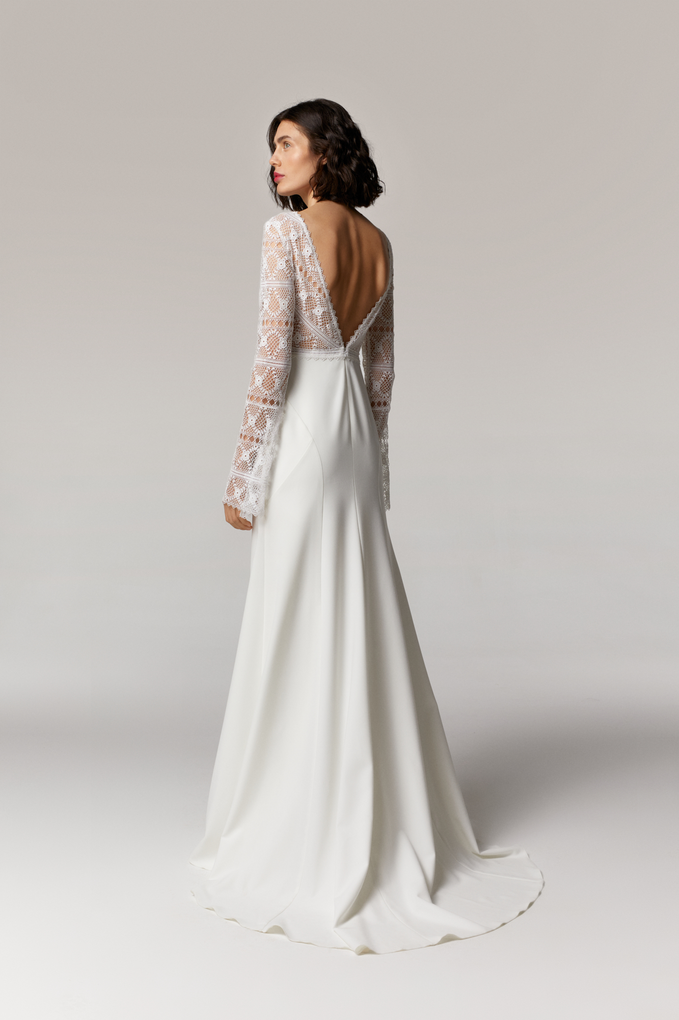 DRESS BOHO V-NECK LONG SLEEVES EMBELLISHMENT LACE IVORY EMBROIDERED CREPE BACKLESS CIVIL CEREMONY PARTY RELAXED MINIMAL COMFORT