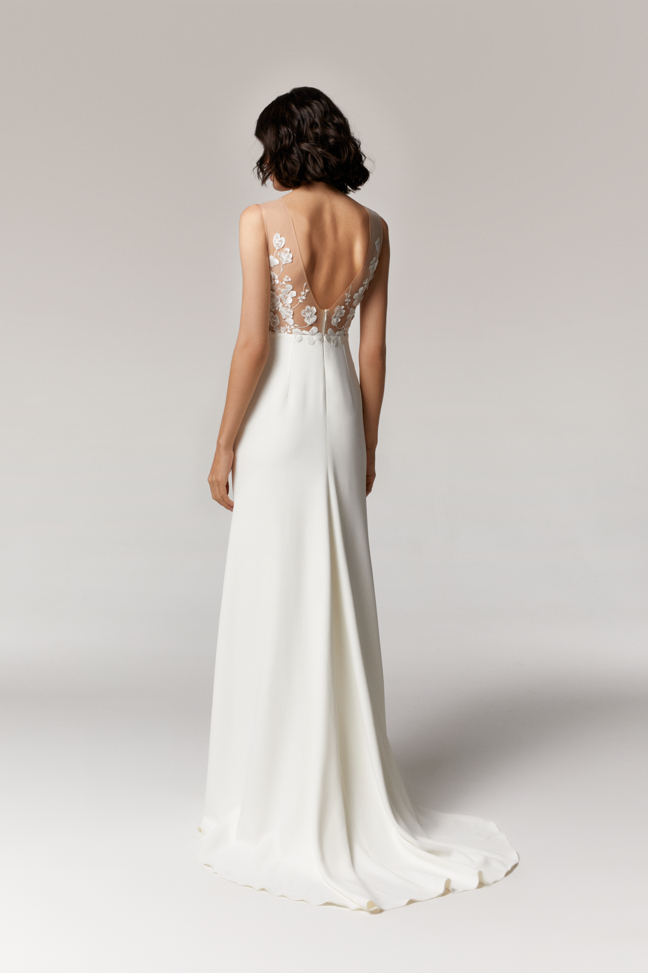 DRESS SCOOP NECK EMBELLISHMENT LACE IVORY EMBROIDERED CREPE BACKLESS CIVIL CEREMONY PARTY RELAXED MINIMAL COMFORT VISCOSE