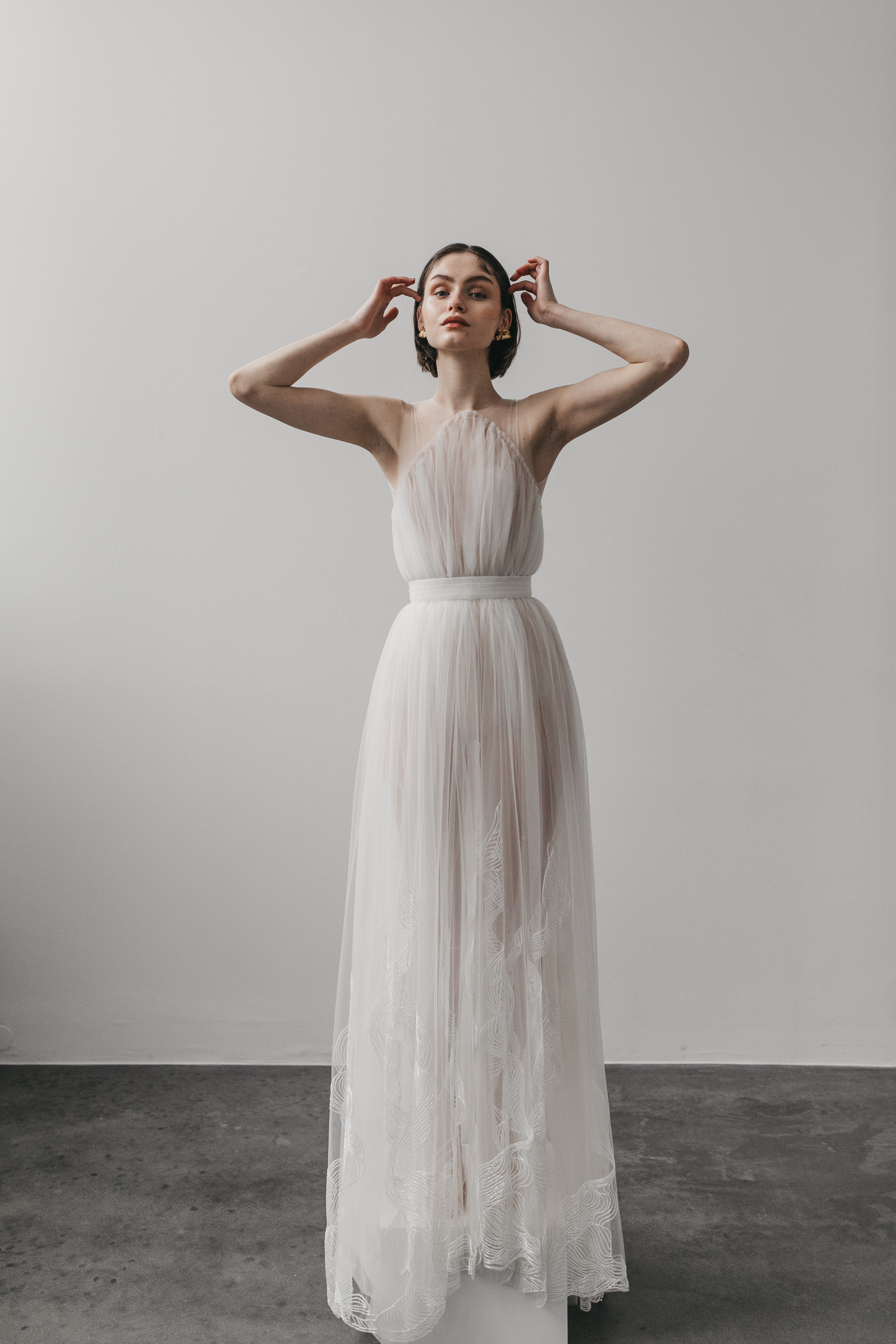 DRESS A-LINE HALTER BACKLESS VOLUME TULLE IVORY EMBROIDERED