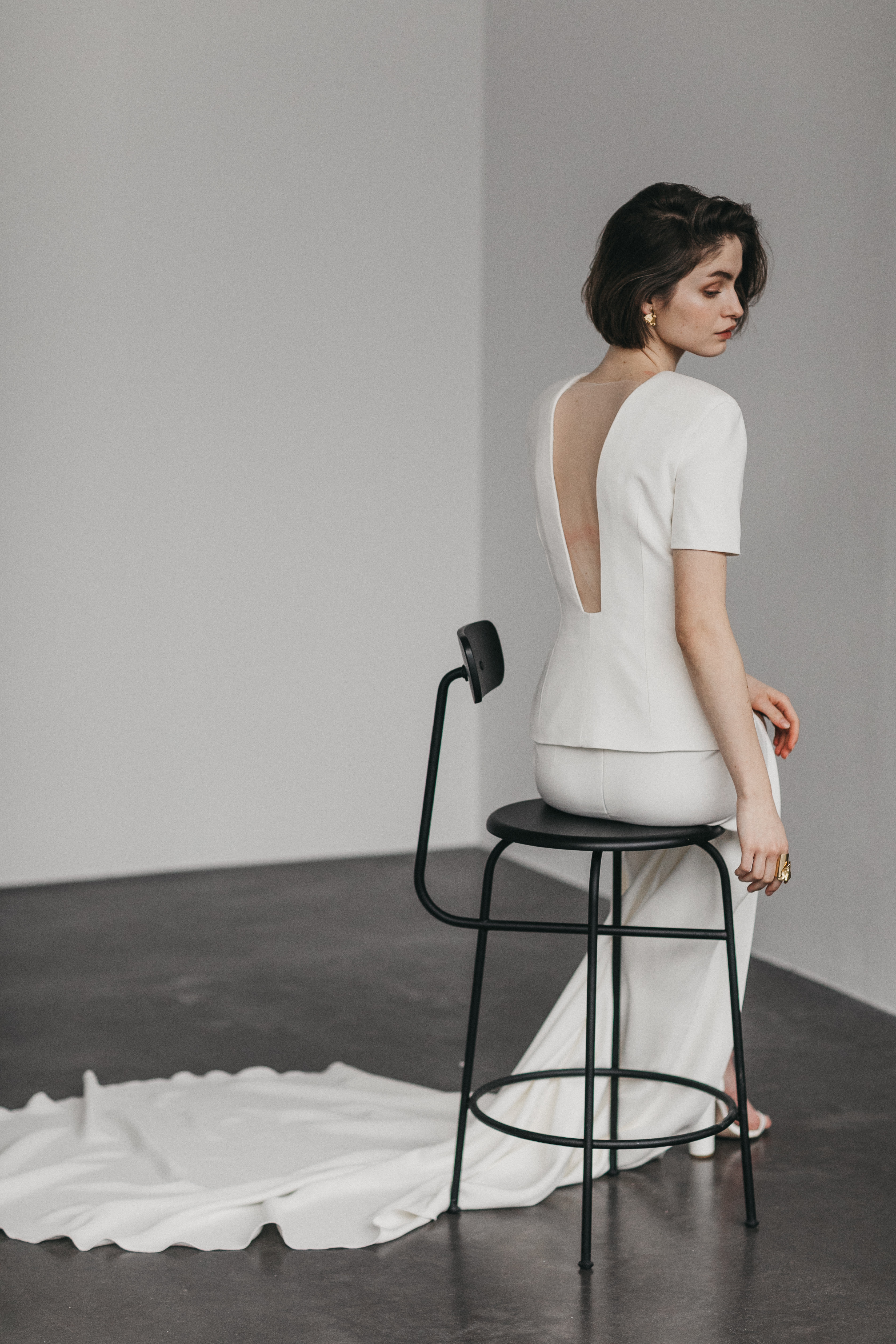 DRESS V-NECK BACKLESS CIVIL CEREMONY TRAIN TWO PIECE SILK OFF WHITE MINIMAL