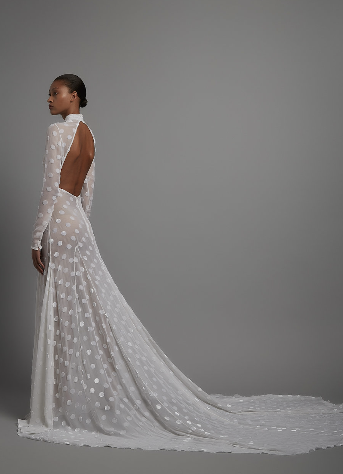 Calypso high neck dress with slim sleeve, open back detail and dramatic train.
