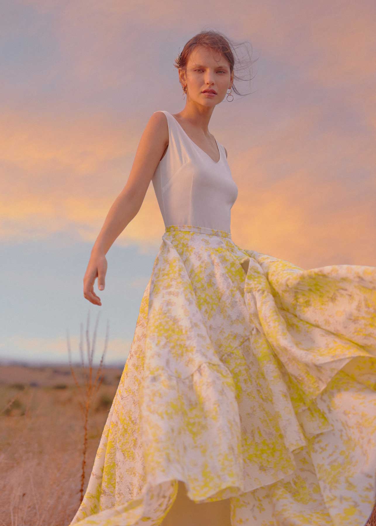 In yellow or off-white, the Iris overskirt is a definite statement piece. Striking for the ceremony and versatile as it can become a second slip-style dress for the reception with a flirty and very elegant touch.
