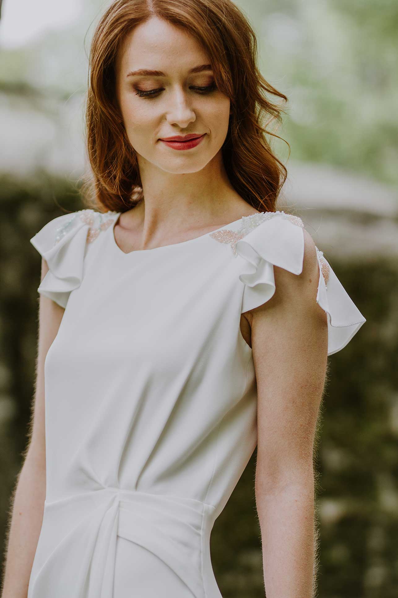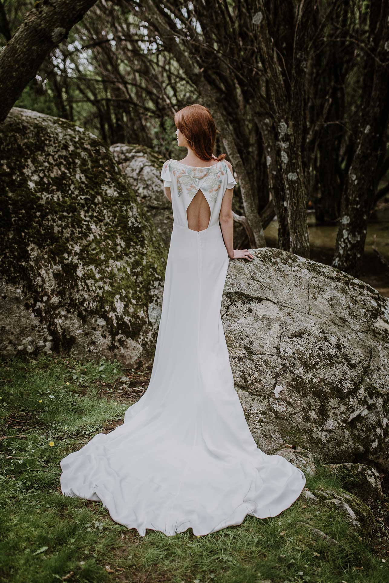 Abellia, pure elegance. A crepe dress that flows in shirred layers to the train, slenderising the silhouette, with an unexpected back – typically Beba’s – embellished with our key embroidery made of tiny flowers, ideal for brides who love delicate, small details.