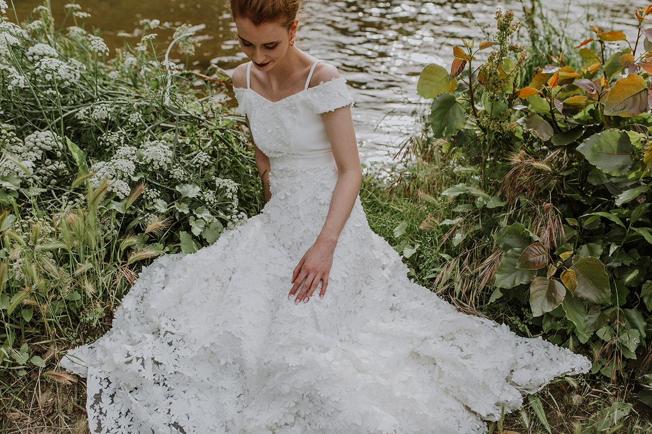 Peonia, a masterpiece skirt full of embroidered flowers with a fitted bodice and a genuine décolletage. Our best-loved dress from the new collection.