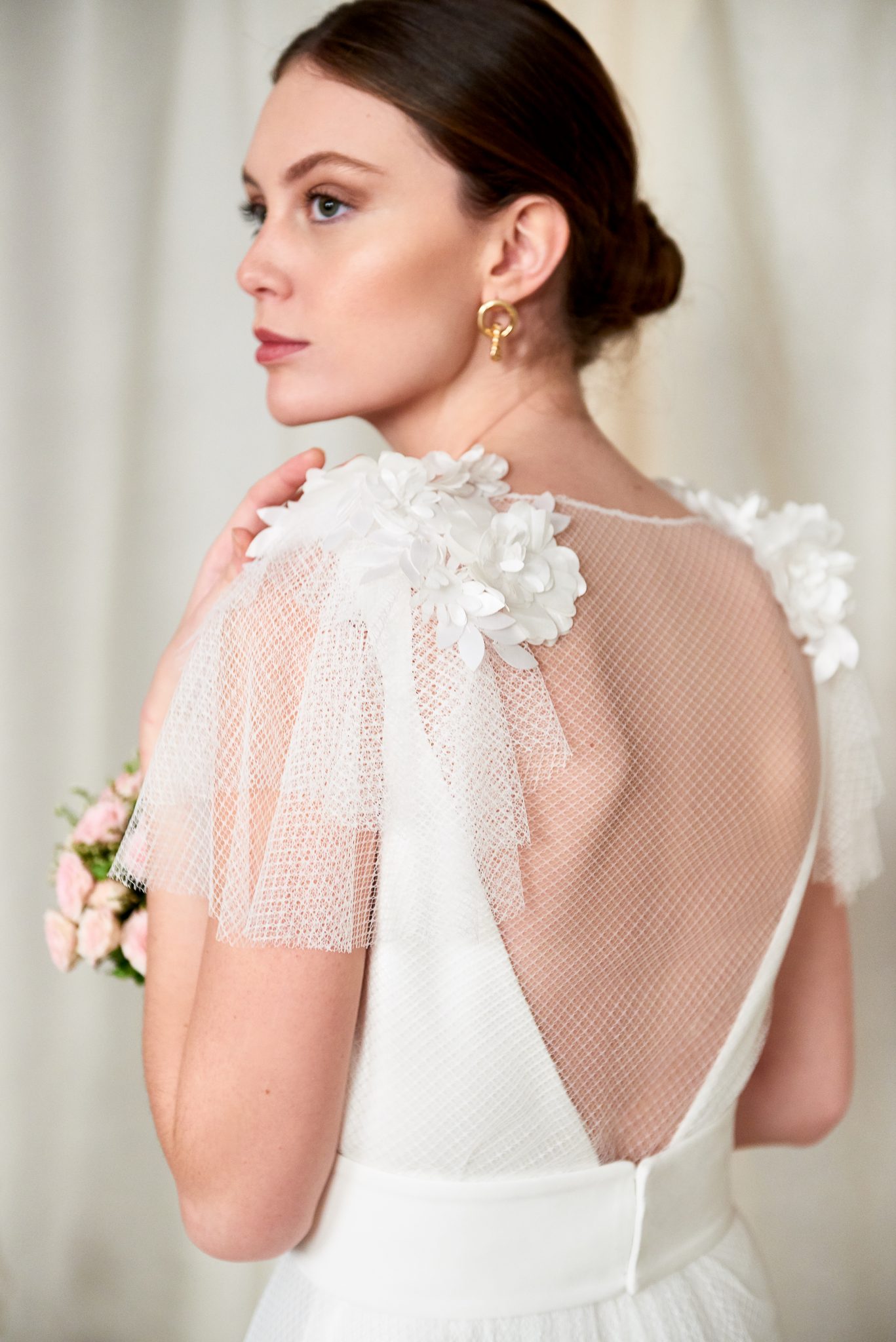 One of the most special pieces of the collection: made of tulle voilette, with various layers as sleeves and a very subtle sheer detail. The customizable add-ons give the final touch, personally picked by the bride. In this case, firstly we have combined it with the Xenia embroidery in arms and belt for a total white look and then, with the Flamula embroidery, for a more vibrant effect.