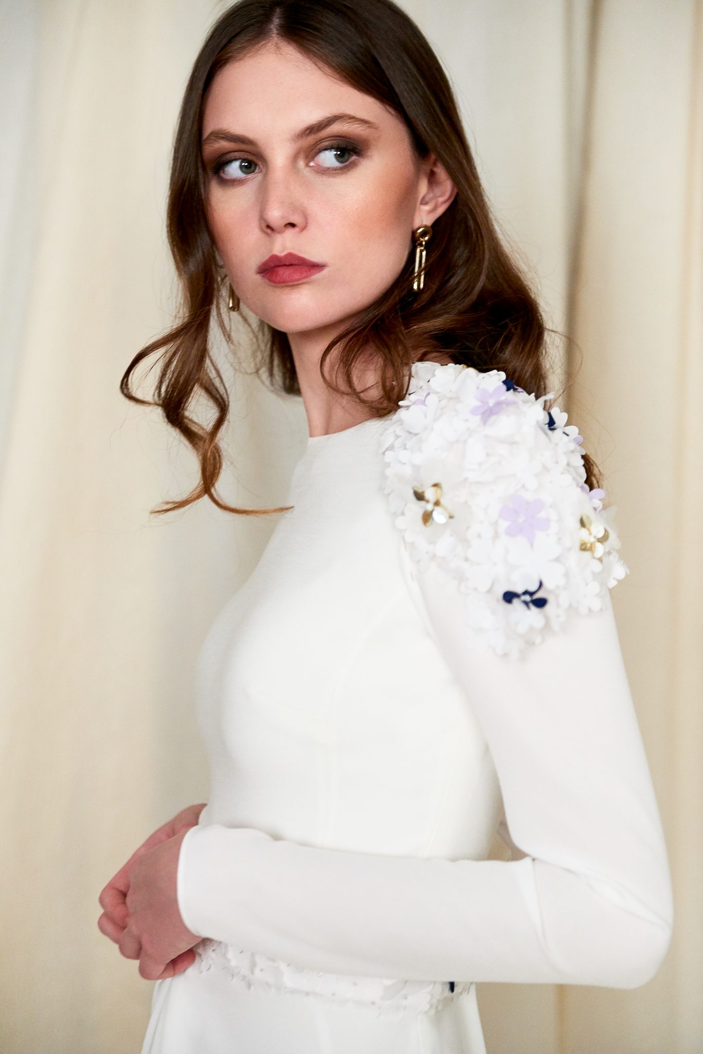 Our marvellous Elisa skirt, with a delicate volume and full of movement due to its pleats and a white strip which sculpts the silhouette. Here, it is combined with shoulder pads and the Barbara belt; all embroidered in organza and with metallic beads.