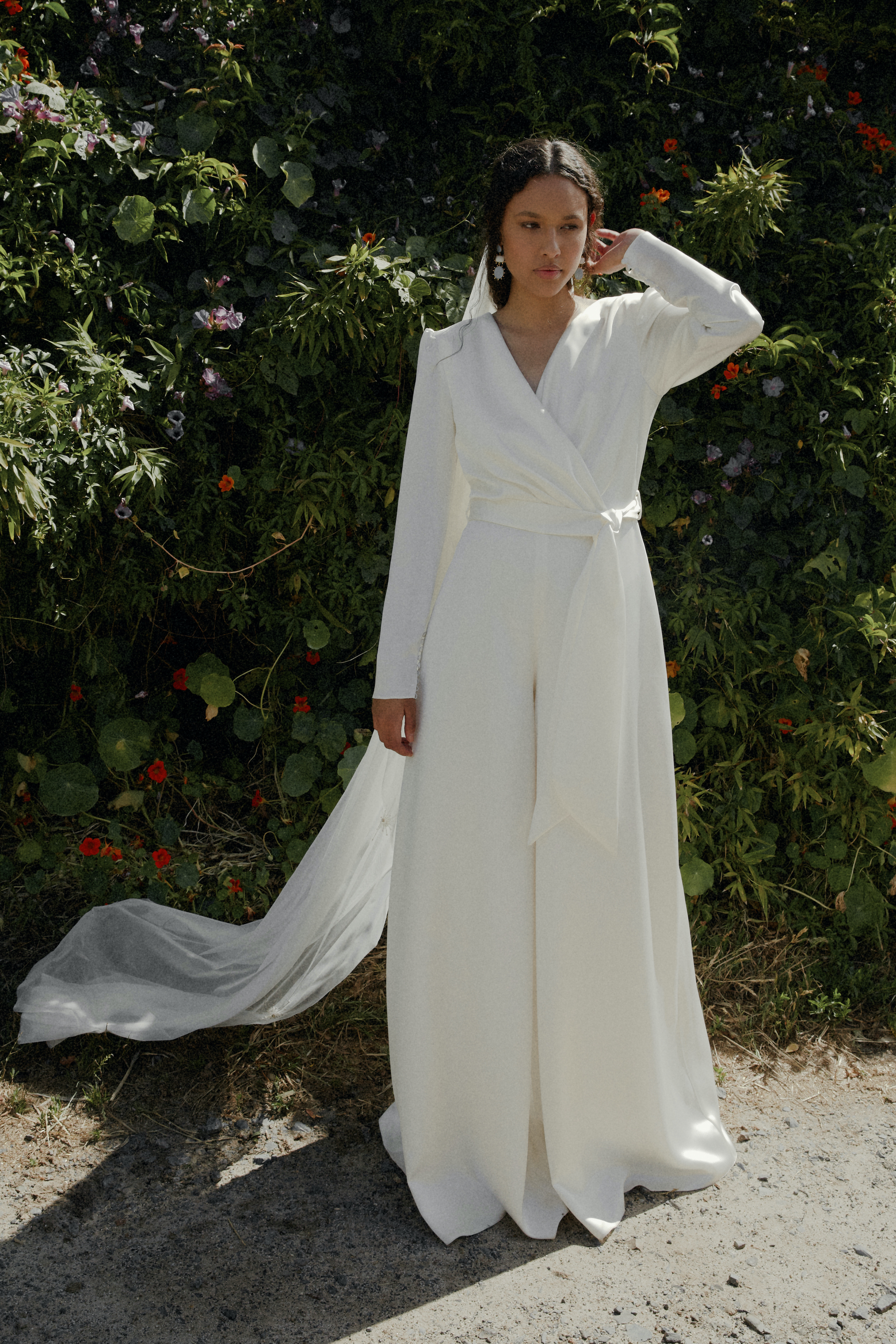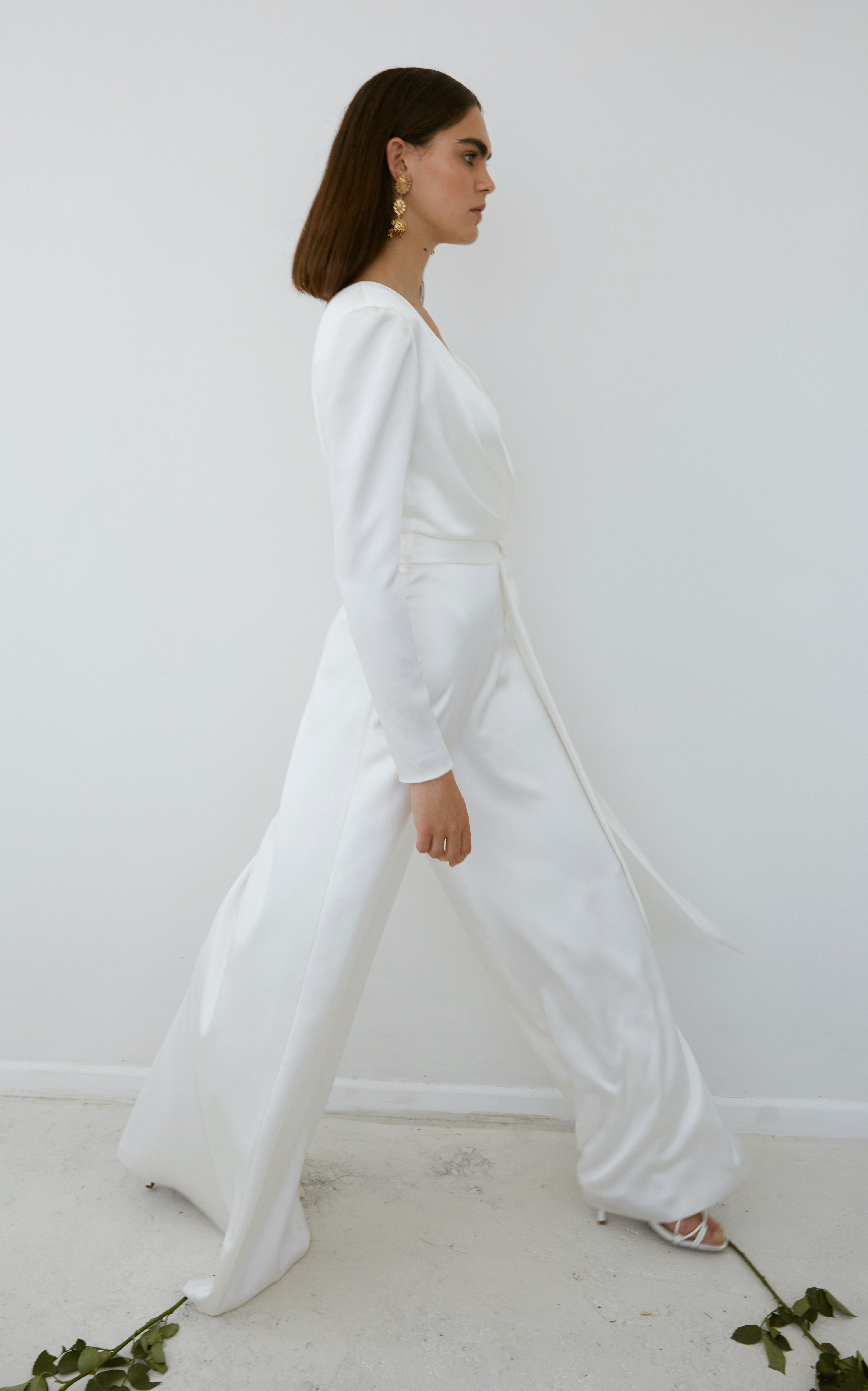 This immaculate jumpsuit features a hand draped bodice with flattering wide-leg pant. This piece is absolute perfection for the modern bride wanting a more tailored piece for an intimate civil ceremony or a second wedding look.