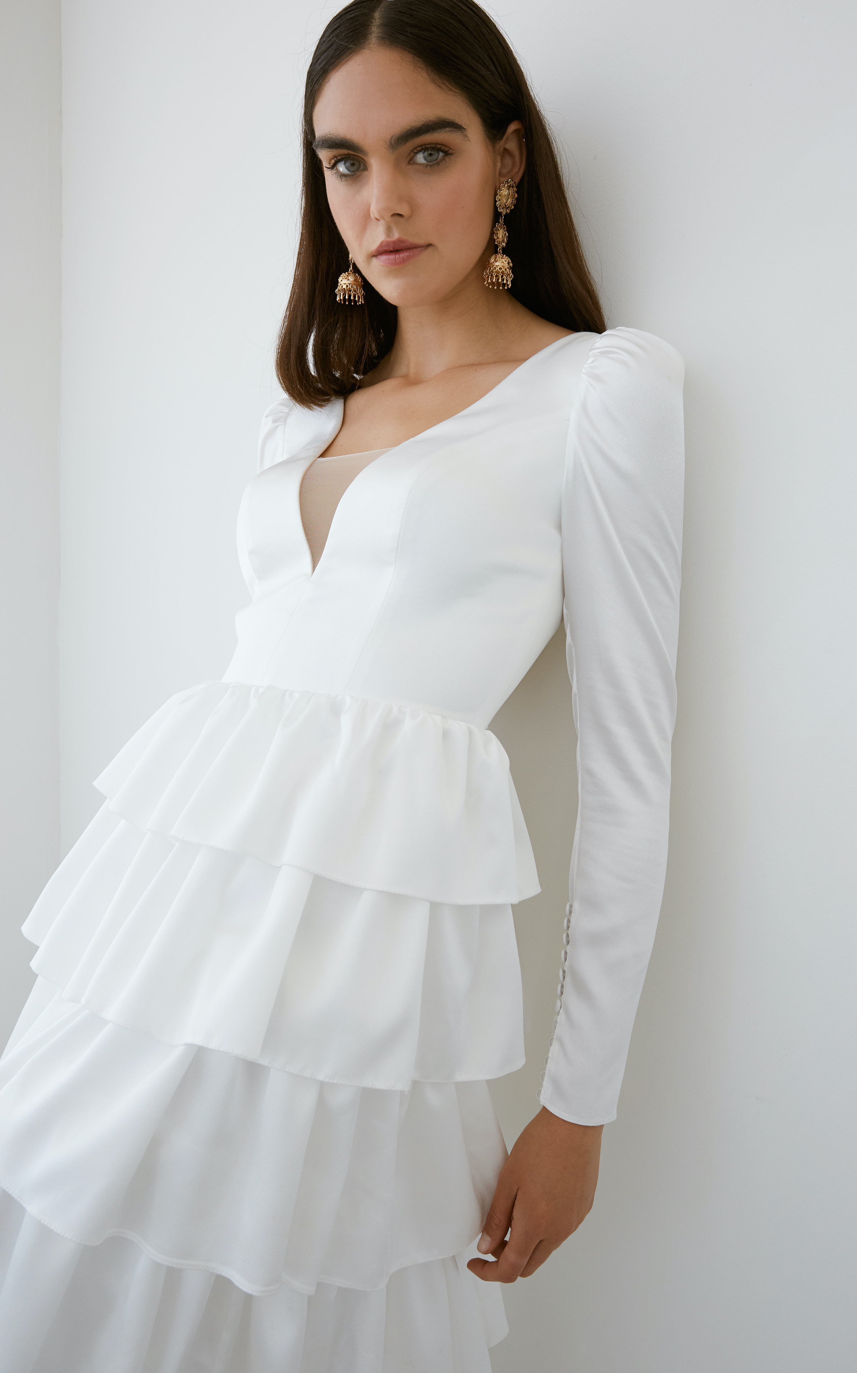 The dress features a show-stopping tiered skirt and plunging V-neckline. Subtle puffs at the shoulders enhance this modern silhouette with no train to encumber all night dancing. This frock is the ultimate civil ceremony come intimate garden wedding piece.