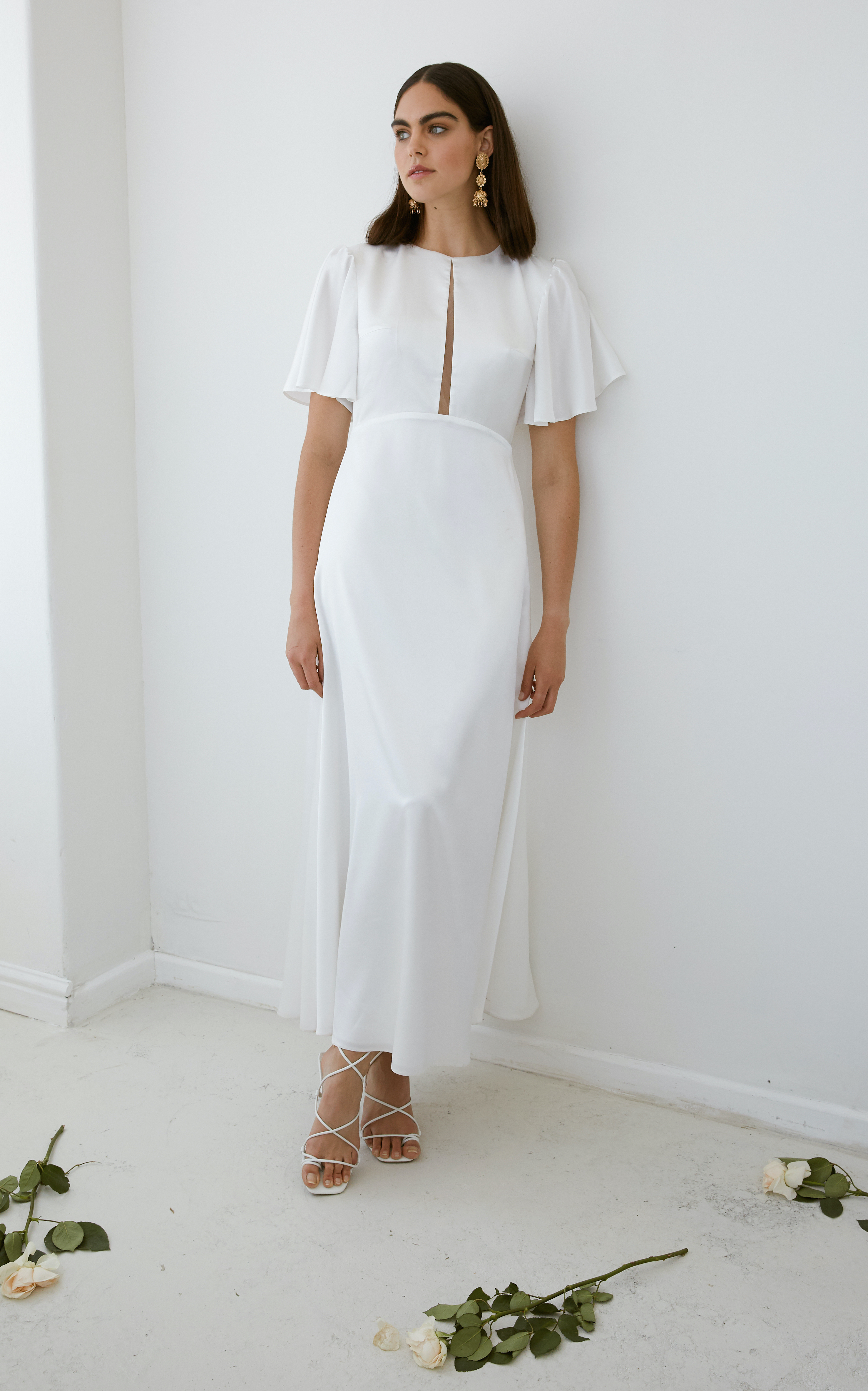 The dress hints at some of our favorite vintage styles from days past with its demure high neck and center front opening. Elegant flouncy sleeves mimic the gentle sway of the A-line skirt, making this the perfect piece for an intimate garden soiree.