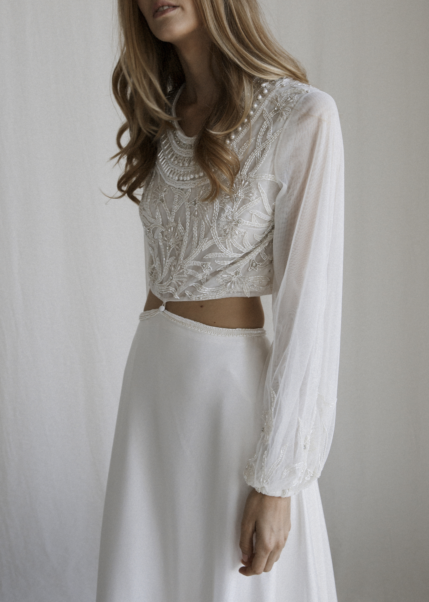 Drawing inspiration from our iconic ISRA gown, the NEVE gown is made from tulle and 100% silk satin. The entirely hand beaded bodice features billowing bishop sleeves and is attached to the skirt at the navel with a silk covered button. The flattering skirt falls effortlessly over the hips into a dramatic train. The top of this gown is available in Antique Gold or Off-White beading.