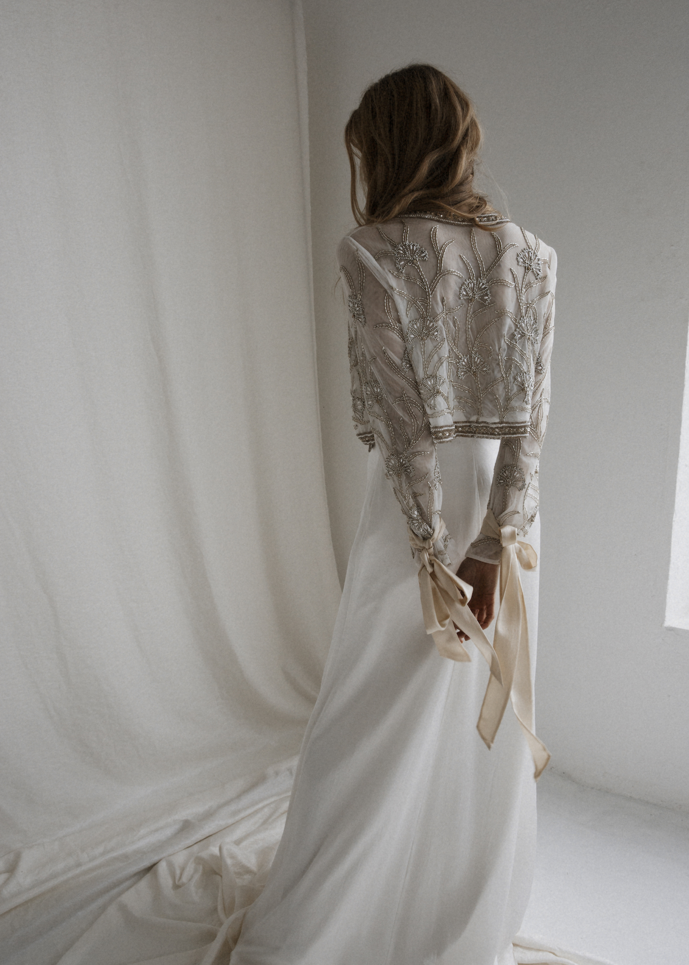 Available to purchase exclusively on the Bo & Luca Online Boutique, the REMI jacket is a playful statement piece. Made from the softest tulle and featuring 100% silk satin wrist ties, the jacket is entirely hand beaded in an exclusive Bo & Luca design. The gown can be closed at the neckline with a hook and eye fastening and is available in Antique Gold or Off-White beadwork.