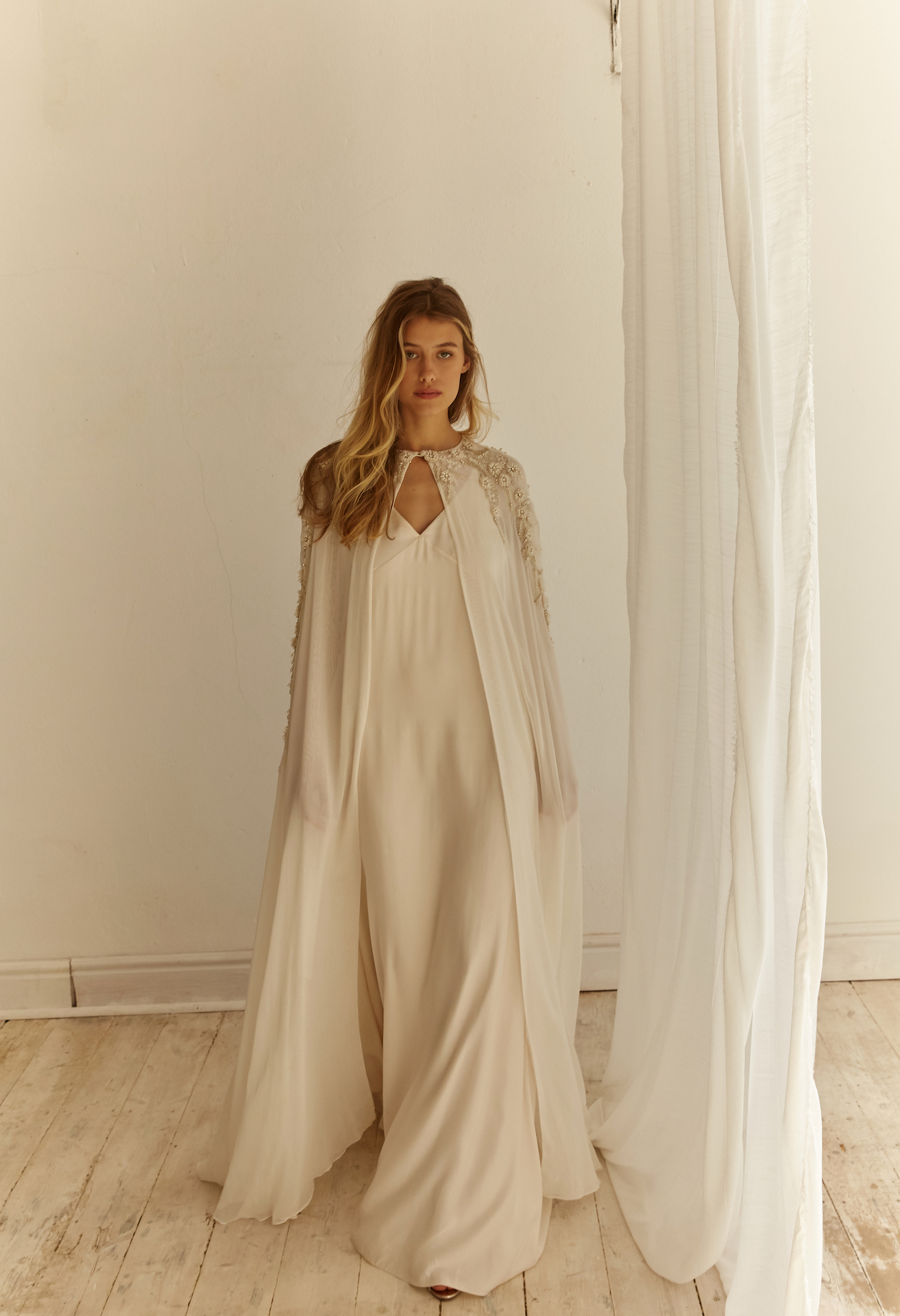 Cut from lightweight Chiffon, this floor-length cape is adorned in a hand-beaded Bo & Luca design. Designed to be worn over a Bo & Luca slip gown, the neckline of the cape is secured by a button and loop at the centre front.