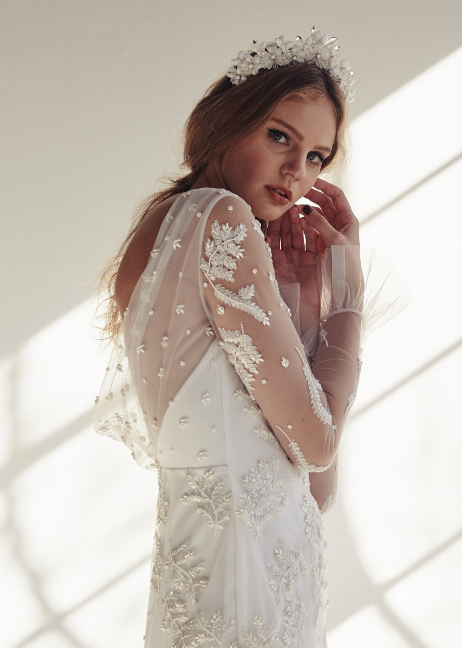 An enduring fit and flare gown featuring a daring cowl back and sheer long sleeves, finished with a delicate wrist frill. The bodice of the LAUREL gown is decorated with a botanically-inspired, pearlescent hand beaded design, while strategically placed godet insets add volume and movement to the tulle skirt.