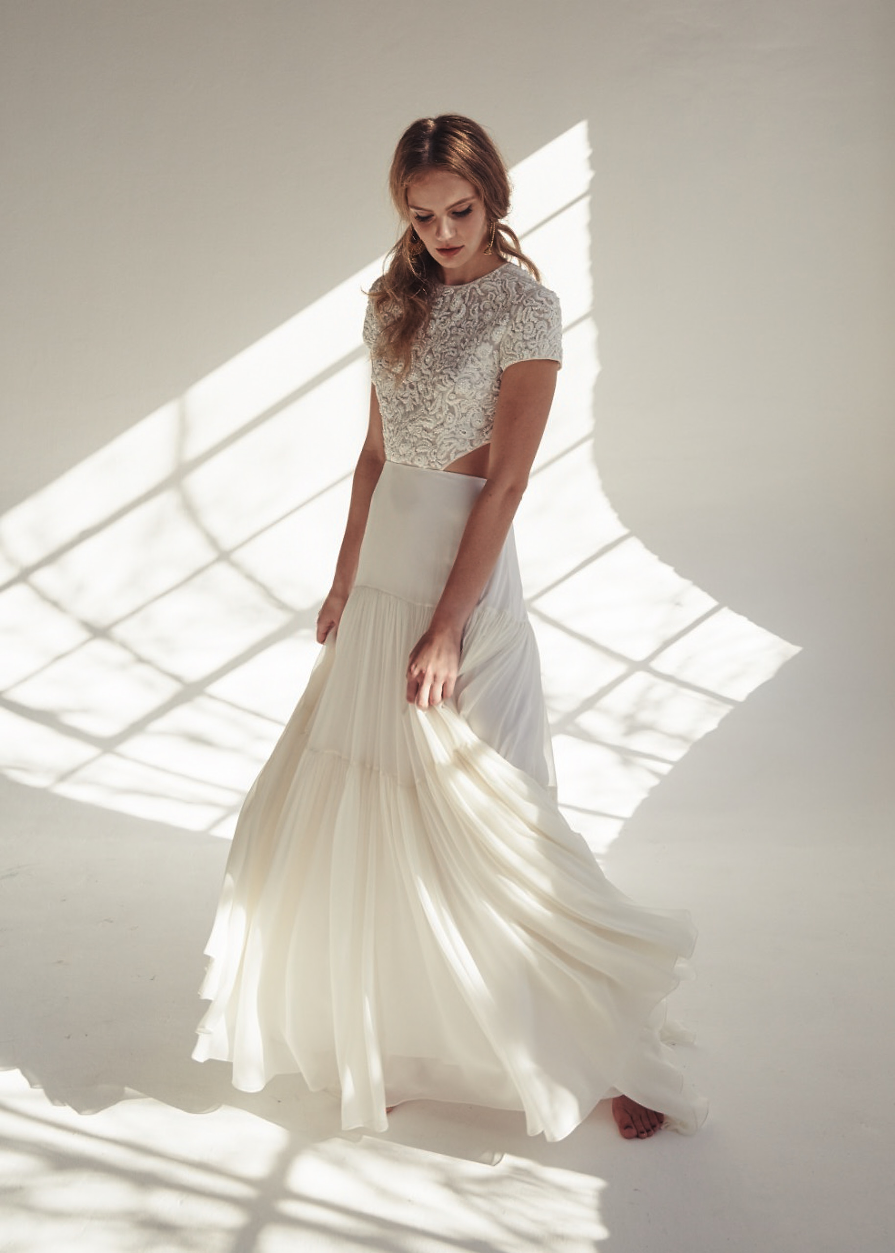 The artful LOLA gown features a fully hand beaded bodice, which is attached to a 100% silk Georgette, gathered skirt. The gown is secured by silk covered buttons that run the length of the cap-sleeved bodice.