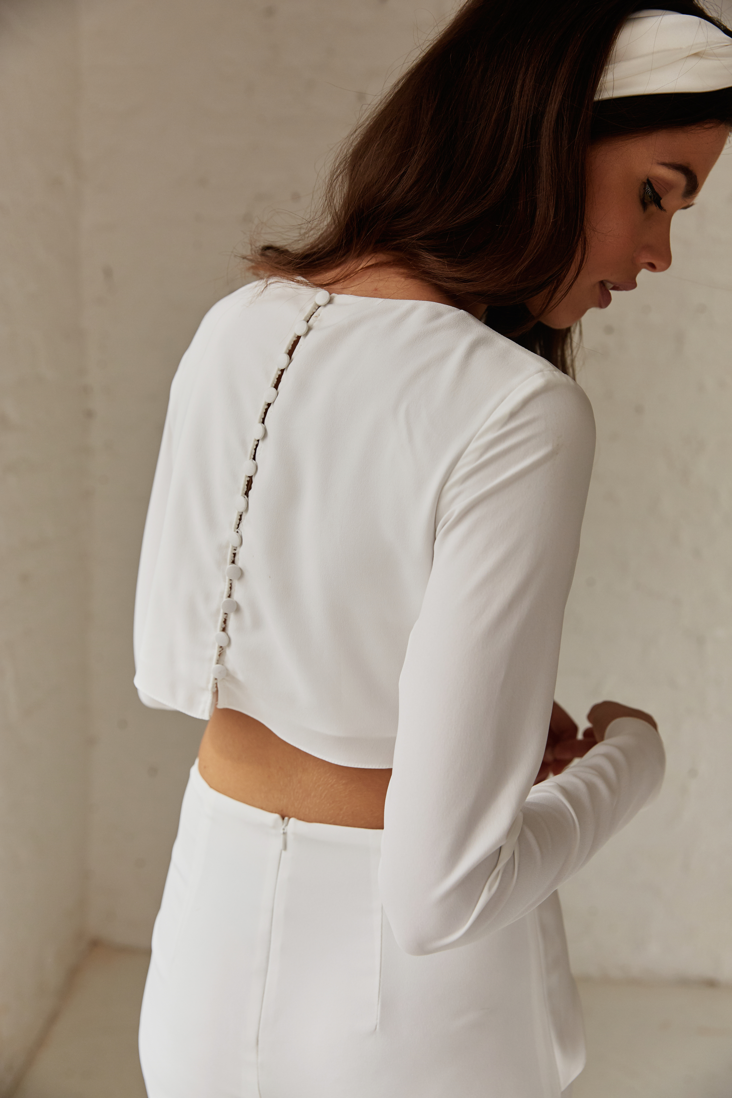 This minimalist gown pays homage to the iconic KINA gown. Made for the free-spirited bride who exudes effortless style and poise. The gown features a tailored high neckline which falls gently into a semi fitted cropped bodice.The bodice is attached to the skirt with a buttery crepe overlay that twists into a delicate knot at the naval.