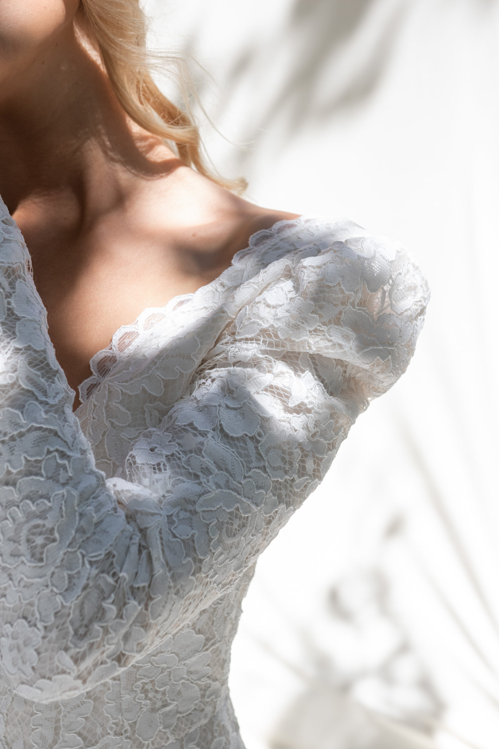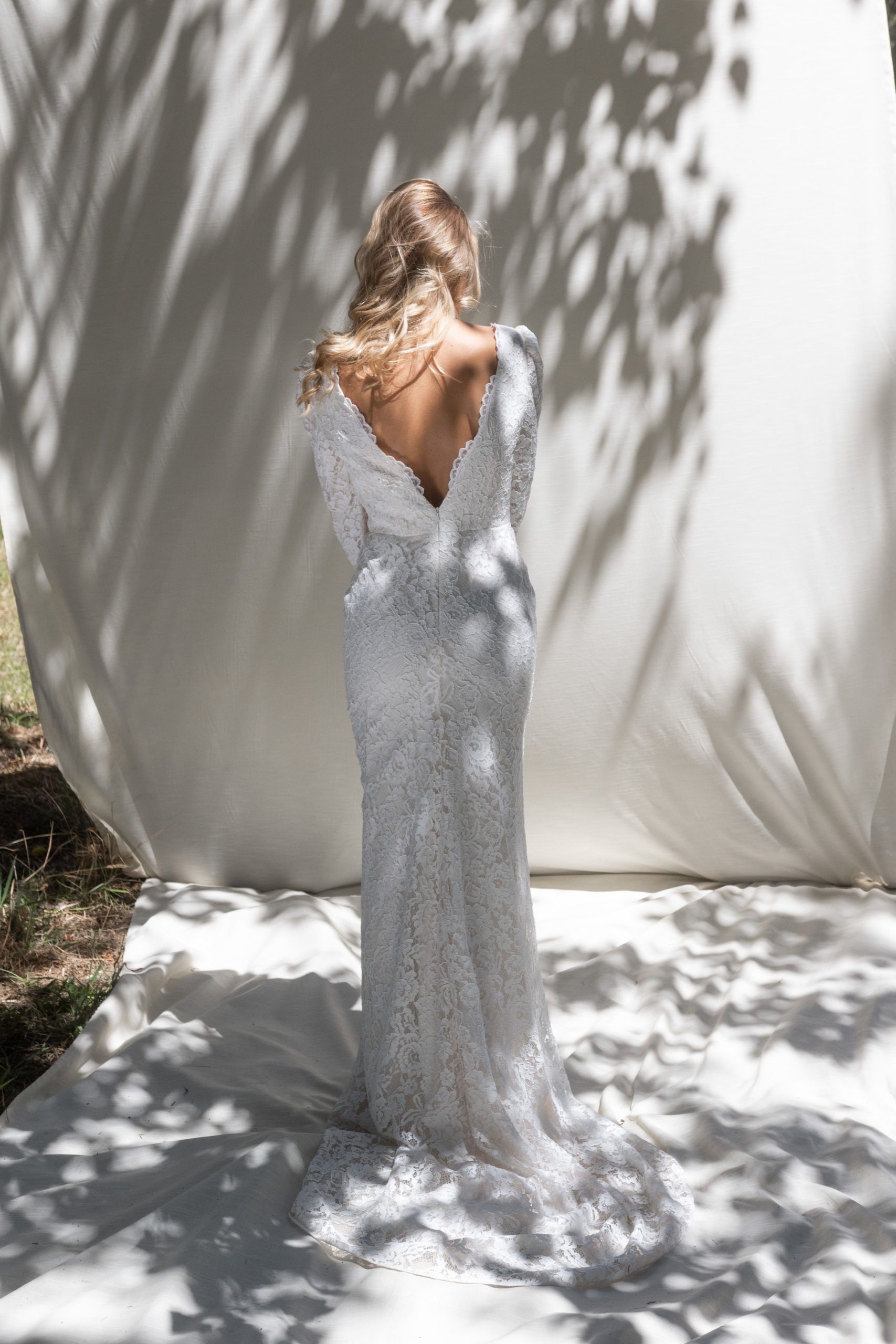 The sophisticated EMMERSON gown features demure long sleeves on a fit-and-flare silhouette. This elegant lace gown further dazzles with a low-V front and back. Subtle details like the small puff at the shoulders and the covered buttons at the wrists make this the ultimate wedding dress for a garden wedding celebration.
