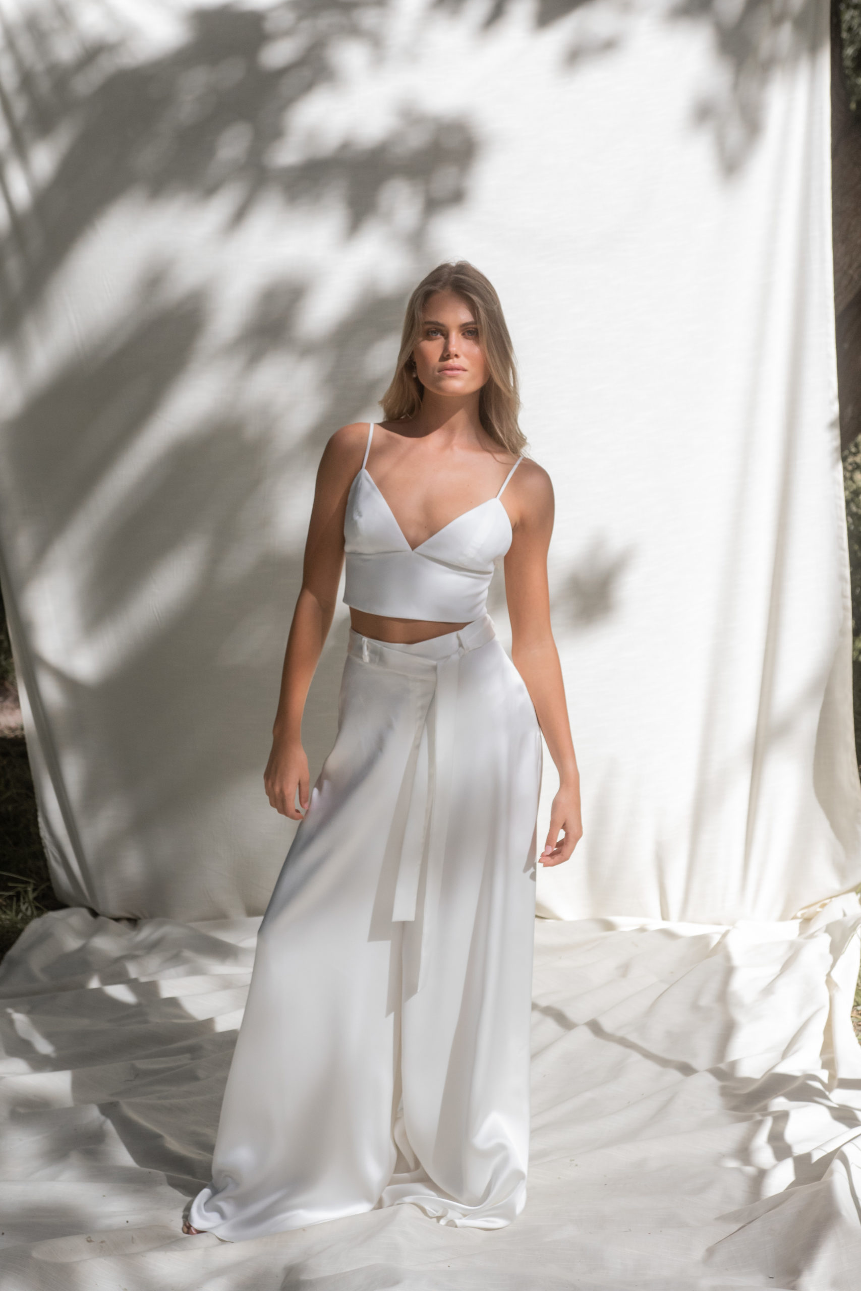 For the bride that doesn’t want to wear a gown on her special day, we introduce to you our PRESLEY wide-leg pants. These high waist pants feature a flattering wide-leg that suits just about every body shape. The waistband is further accentuated with a waist tie that you can style long or in a loose bow. Style your PRESLEY pants with our selection of lace tops and strappy bralettes to make this look your own.