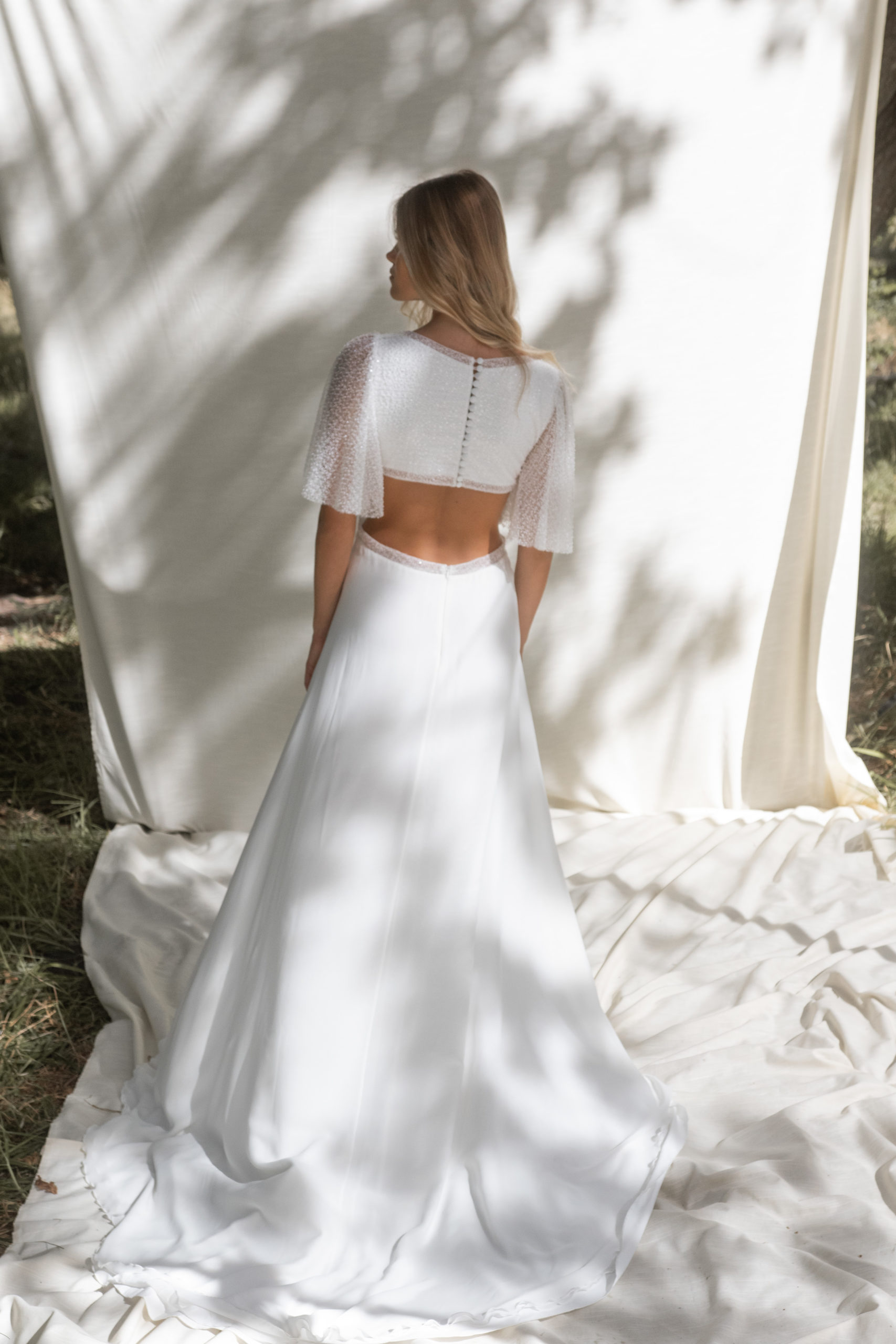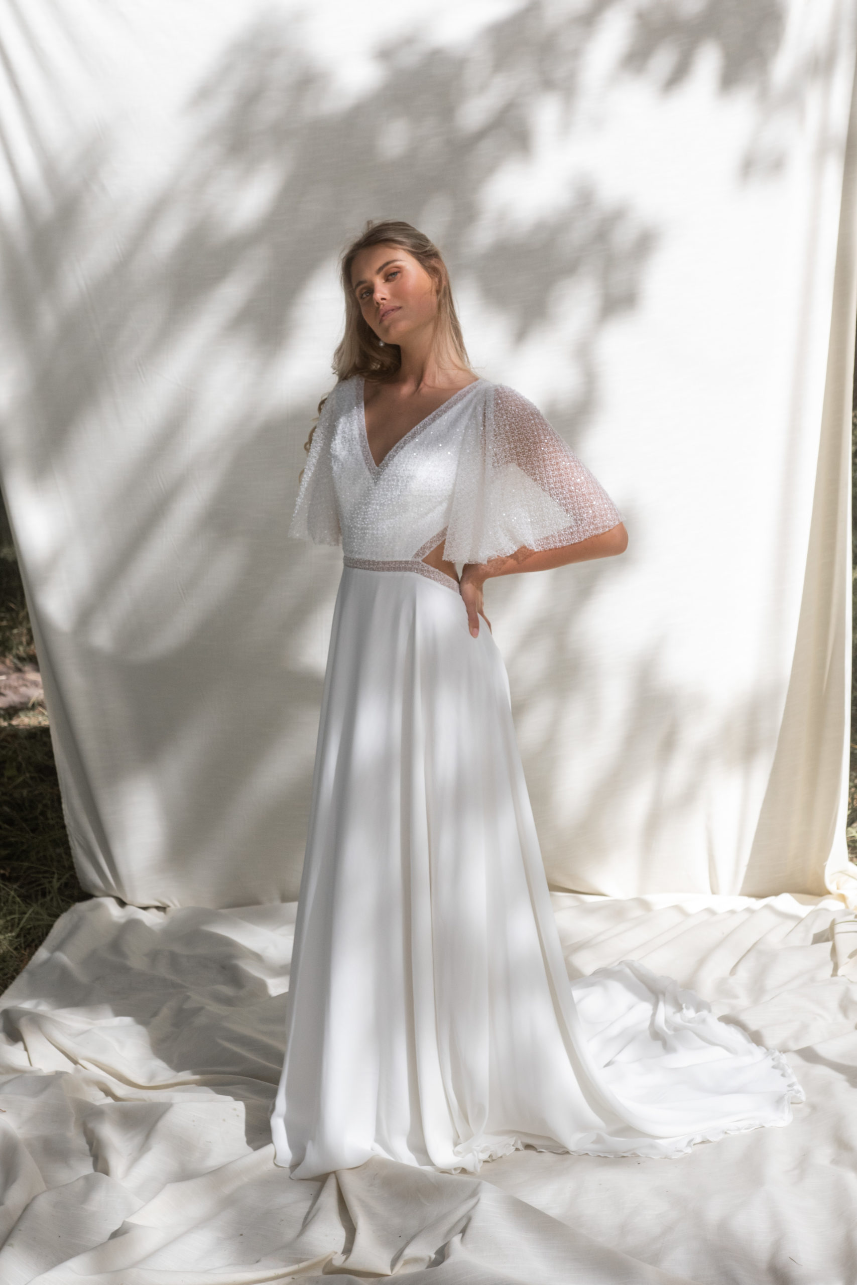 The whimsical WILLOW gown is an updated take on our iconic ROSA gown. The delicately beaded bodice features flouncy, fluted sleeves and side waist cutouts that trail all along the curve of the torso to the back. To enhance the romantic feel of this gown, we’ve added soft chiffon, A-line skirt that flatters just about every body shape.