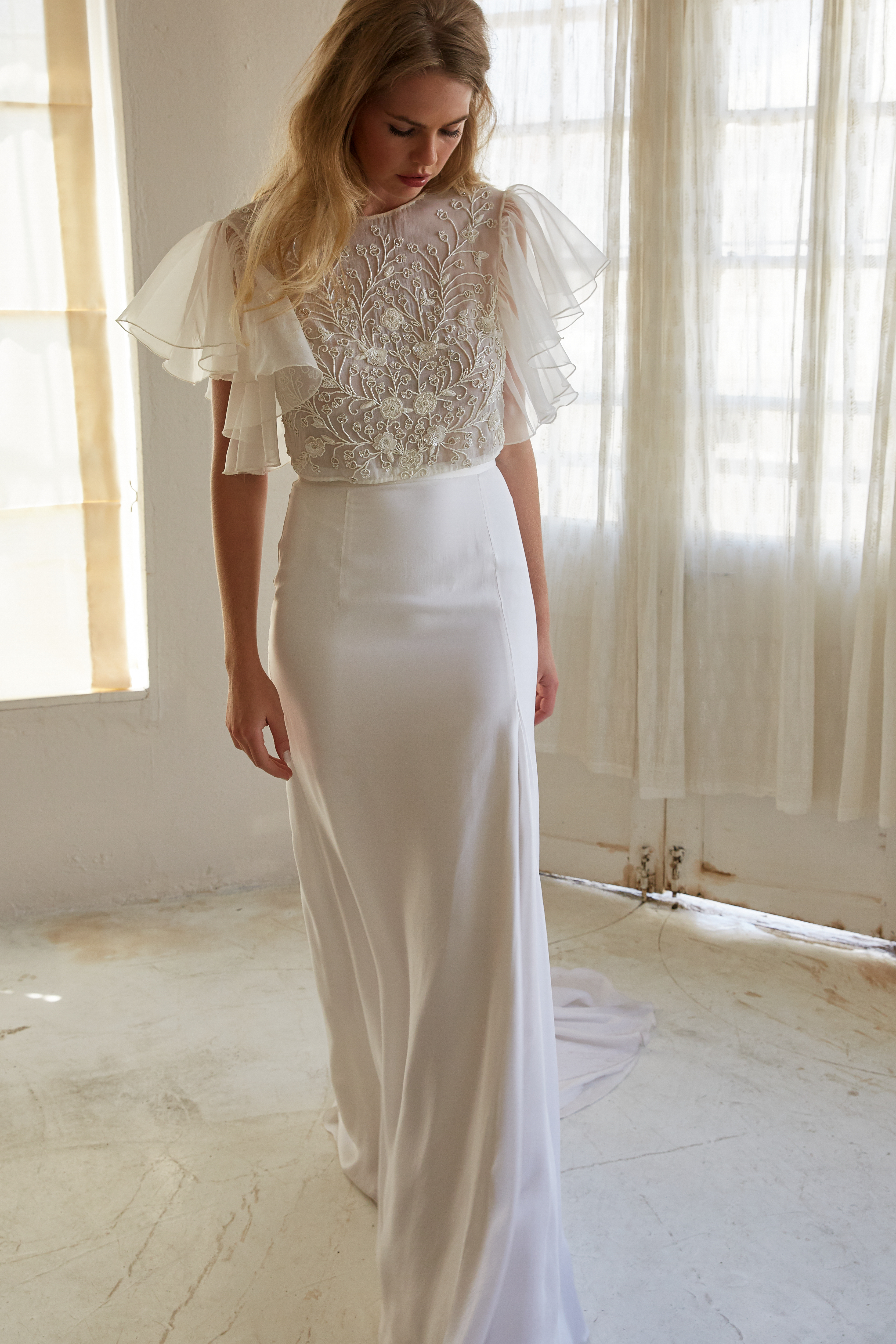 Make a statement with this intricately hand beaded top, which is adorned in an exclusive Temple by Bo & Luca design. Made from a delicate chiffon, the top is semi-fitted and closes with an invisible side zipper. Organza drop-shoulder sleeves complete the top beautifully.