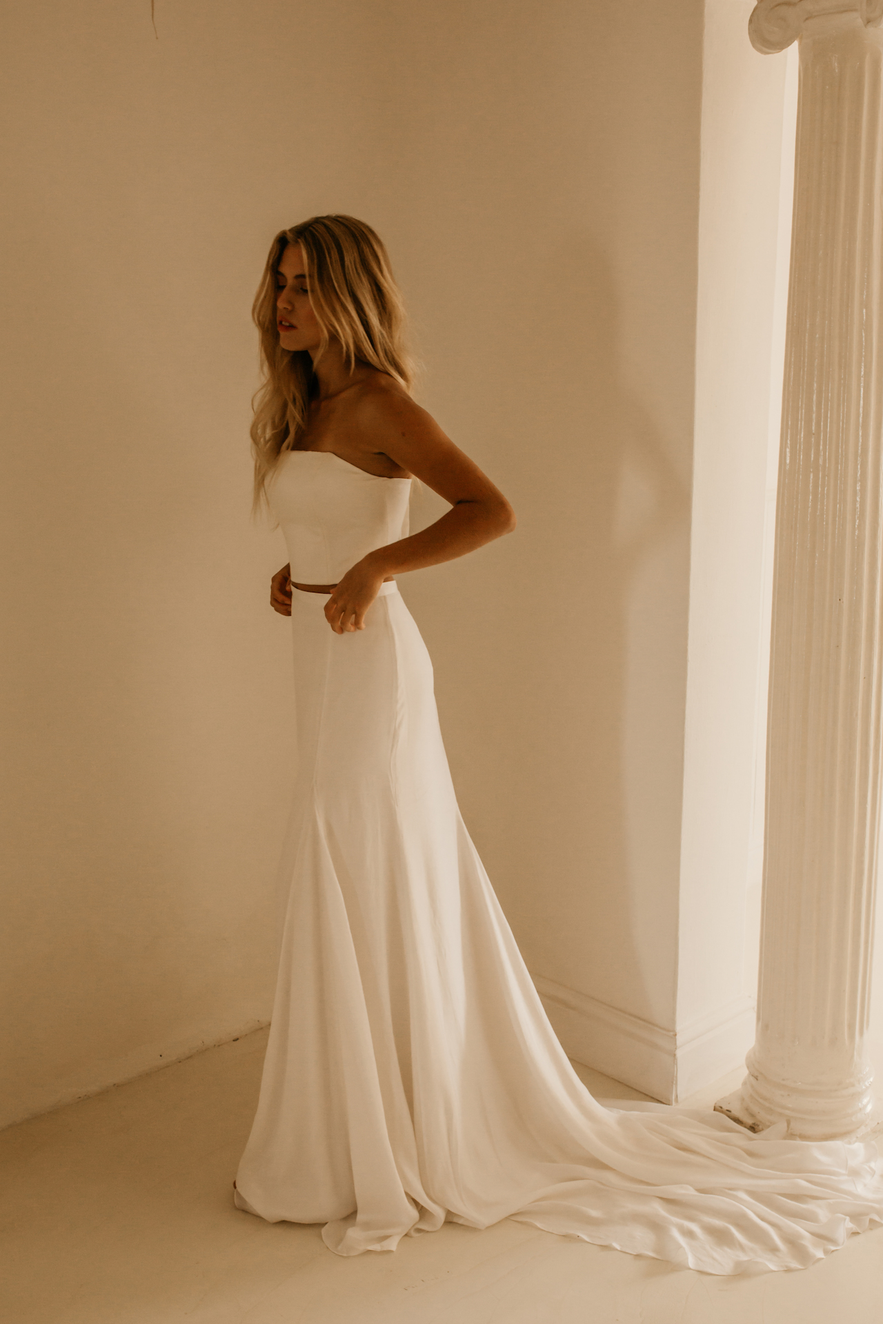 Made from the silkiest of satins, this semi-fitted, floor length skirt is the ideal, pared-back addition to your wedding day ensemble. Satin godet insets add volume and movement to this high waisted skirt, making it perfect for sashaying on the dance floor. When paired with the intricate RENO Top, this skirt is taken to new levels of alluring.