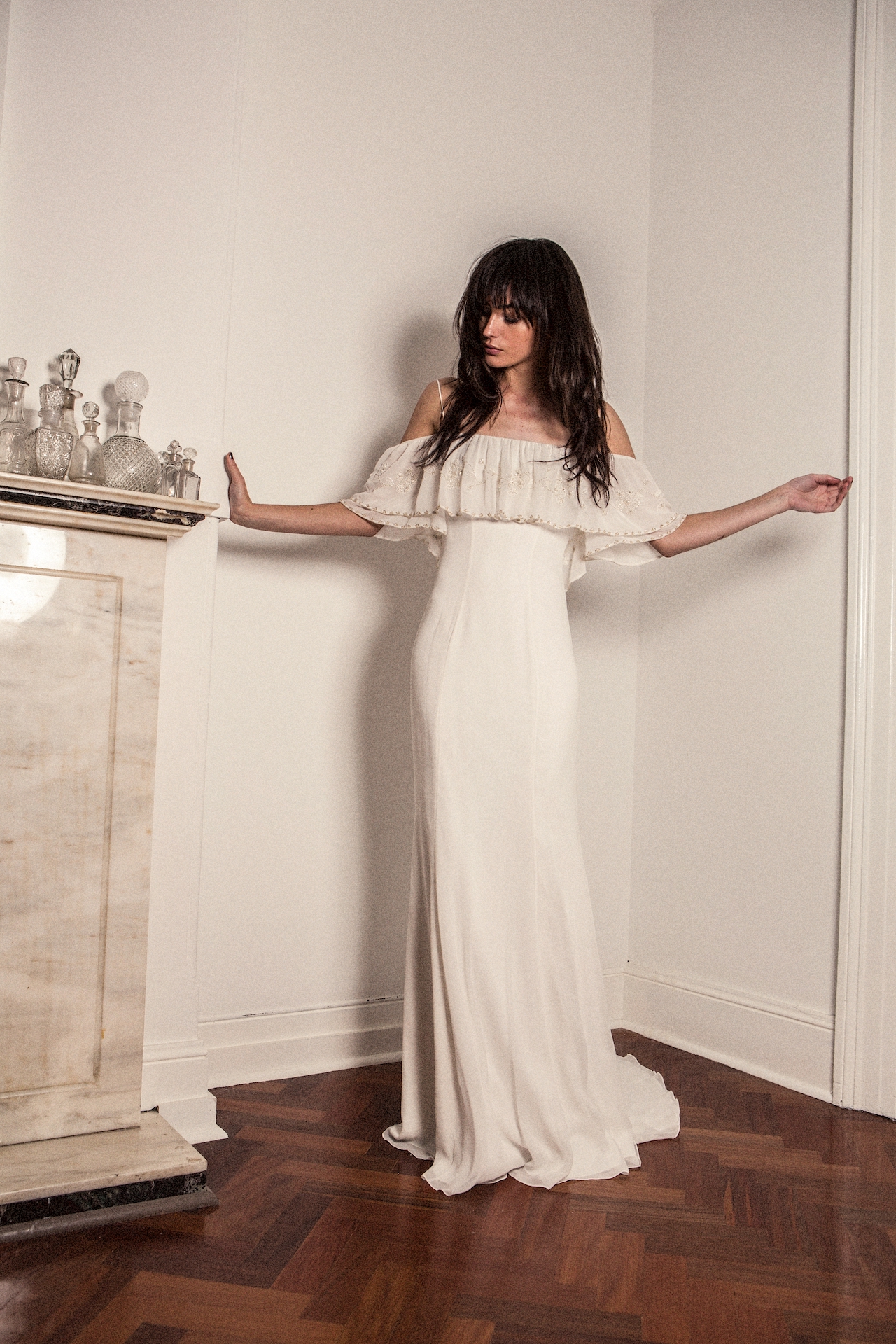 The bohemian SKYE gown features an elegant fit and flare silhouette that hugs the body in just the right places. The bust of this gown is accentuated and adorned with a delicately hand beaded and gathered frill that follows through to the low V-back. Thin bias straps ensure that this gown drapes the body comfortably.