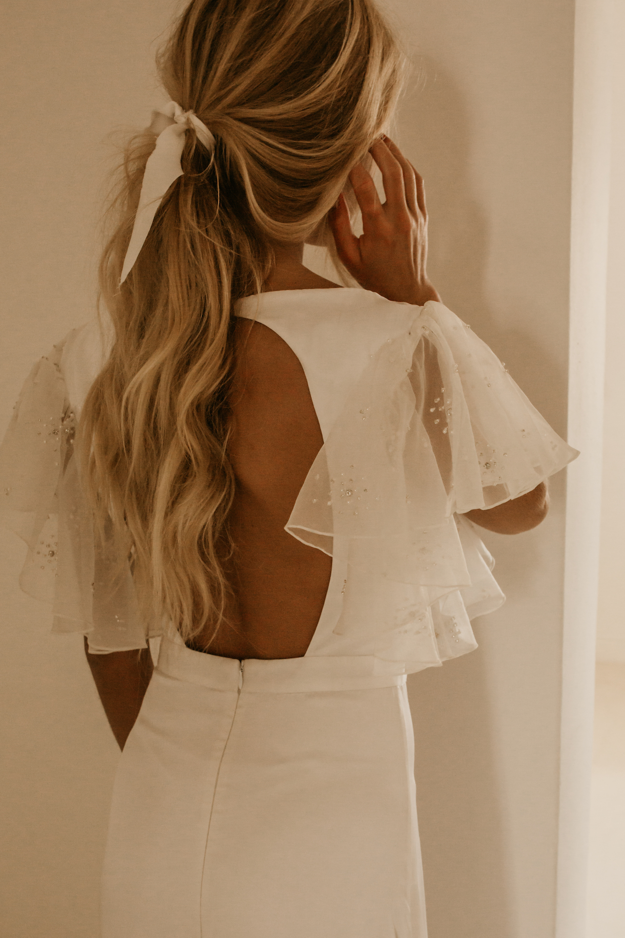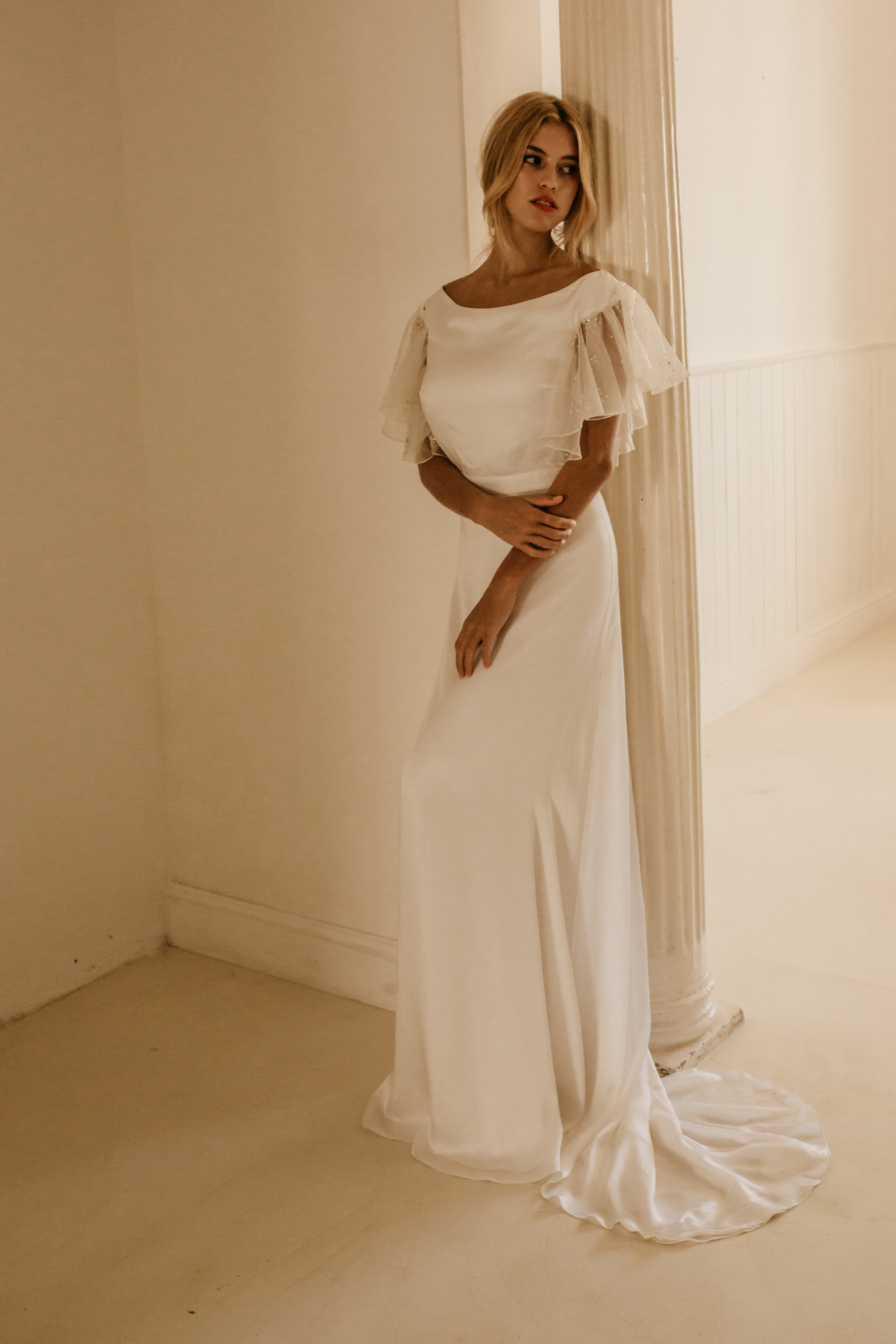 The contemporary yet classic YORK gown is made from lustrous satin and features an elegant boat neckline. The gown is fitted at the bodice and waist before falling into a fluid A-line skirt and train. The dramatic Organza sleeves are hand beaded in an exclusive Temple by Bo & Luca design. A daring open back completes the gown. This gown is available to purchase exclusively from the Bo & Luca e-boutique.