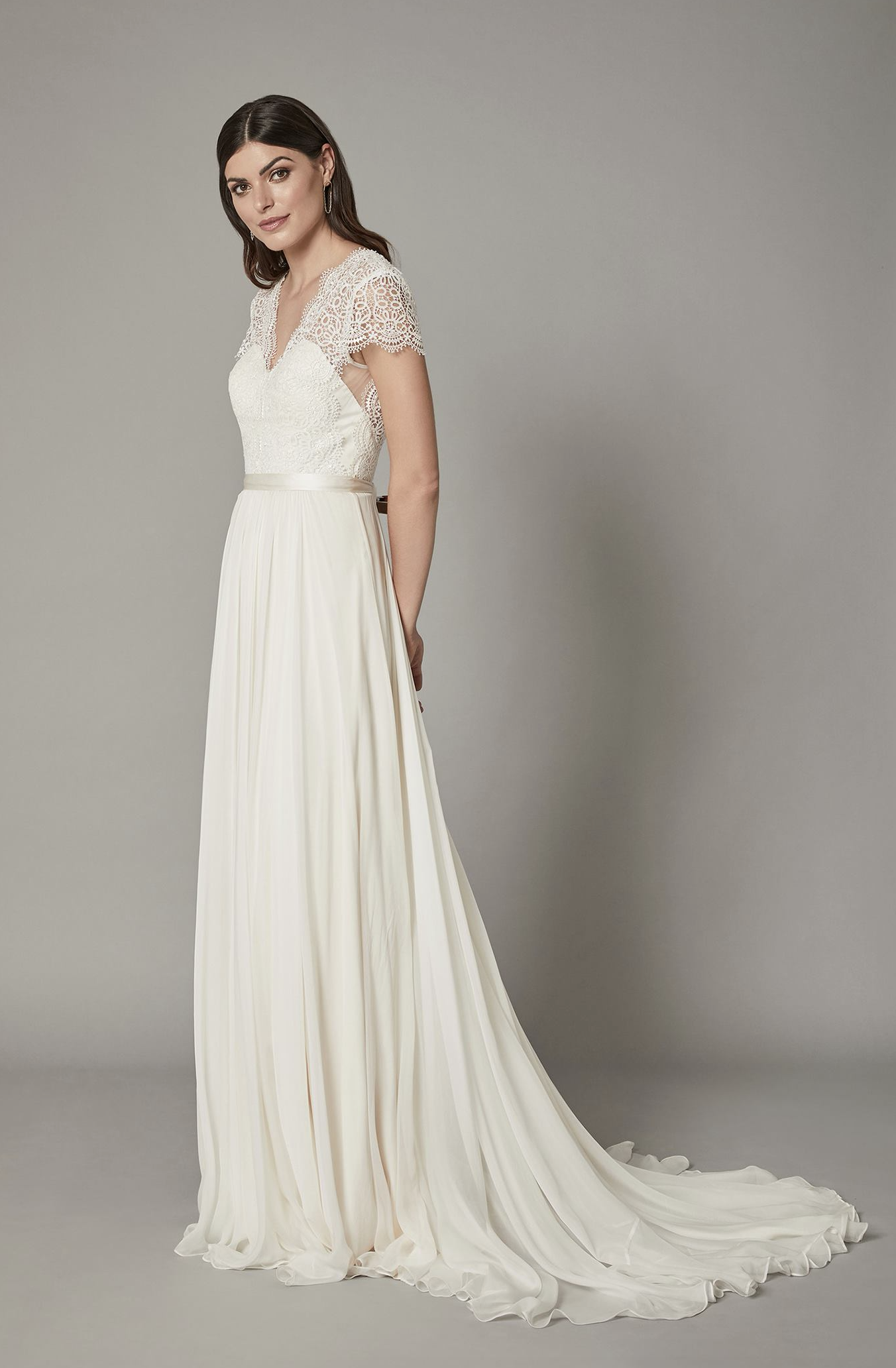 A vision of classic romance, the Miles Gown is a bridal style that really captivates. Entrancing graphic lace spirals over the bodice and dips into a deep “V” back that’s framed by a satin sash that ties into a sweet bow. Cascading from the waistband is an endless silk chiffon that pools into a dreamy train and finishes this charming style