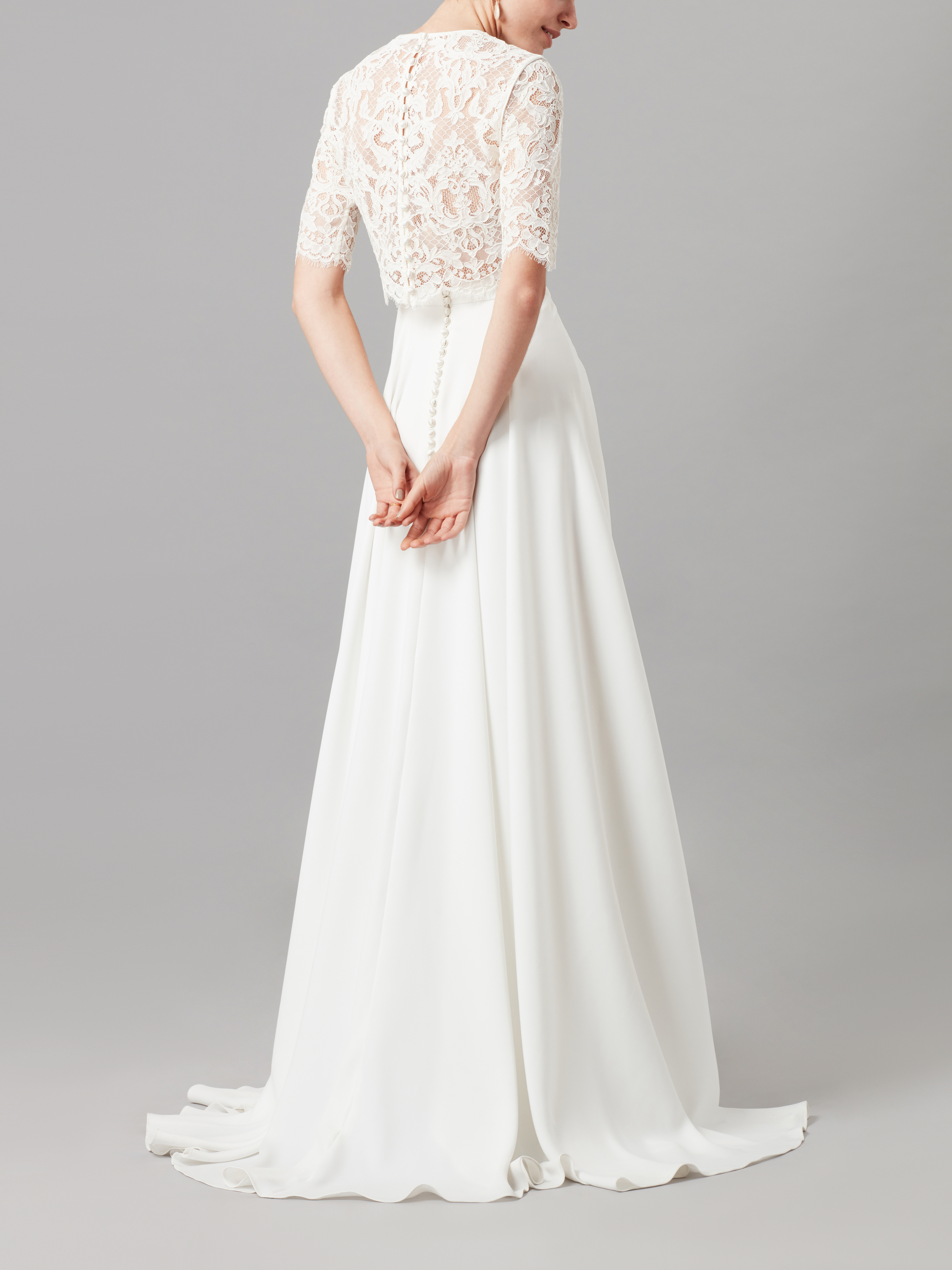 Delicate floral corded lace with fine scalloped edging makes the cropped Dasha overlay the ultimate essential for the fashion forward, modern bride seeking a twist on a classic piece.