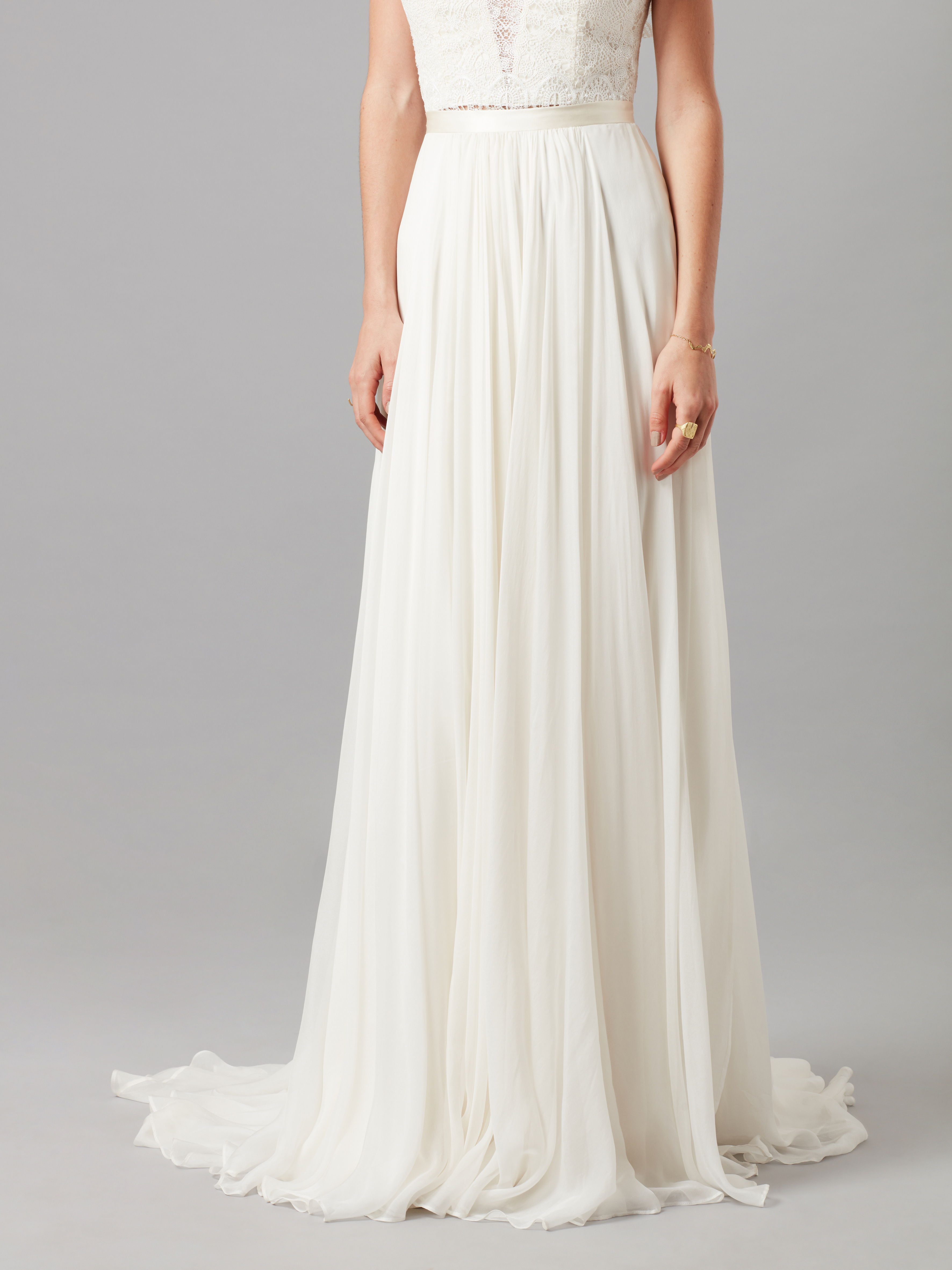 The romantic and dreamy draped silk chiffon Delia skirts natural cascades from the fitted satin waist band to fall endlessly into a soft-pool train. Classic and timeless, let your heart run away with the most charming skirt of them all.