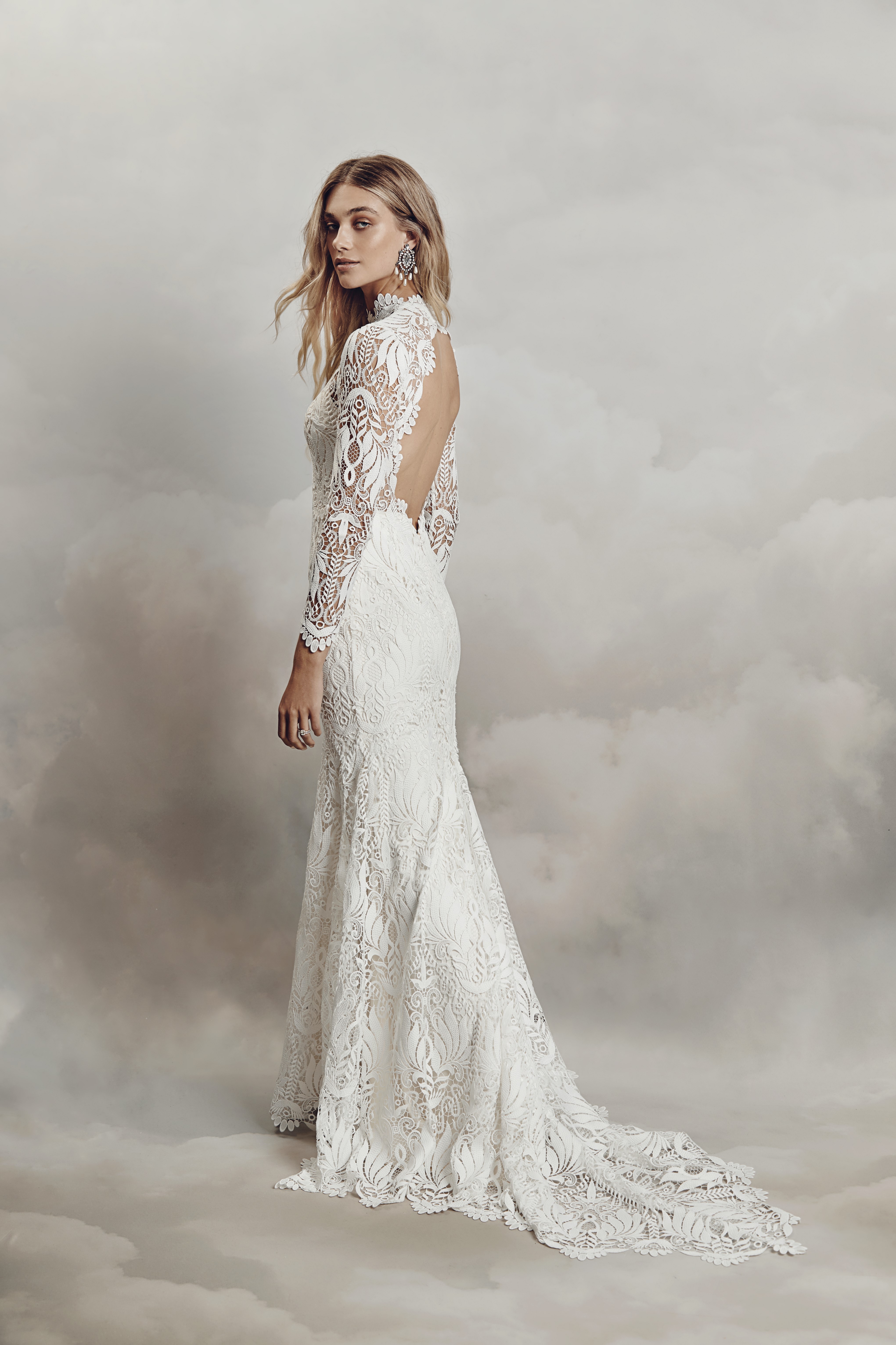 DRESS BOHO HIGH-NECK LONG SLEEVES LACE IVORY FITTED BACKLESS CIVIL CEREMONY PARTY COMFORT