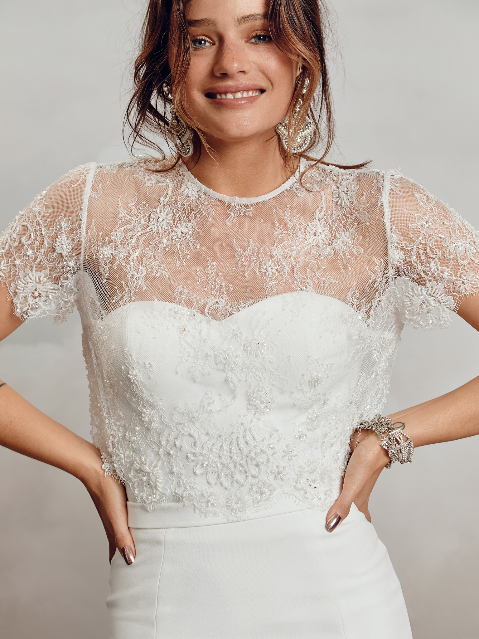 The scalloped edged Gracie Top is a sophisticated vision of exquisite sheer lace, embellished with intricate beading. With versatility which allows you to play with layering, transforming your look in a moment. Layered over or under another Catherine Deane item for a demure ceremony look, or worn individually to make a sensual statement at your reception.
