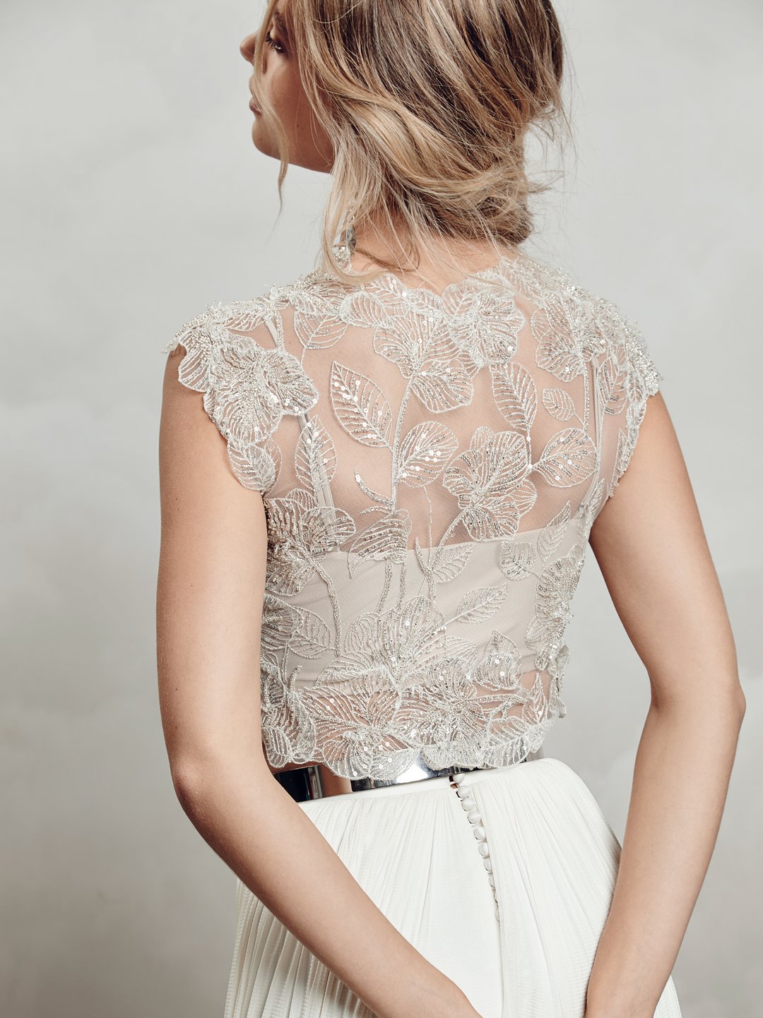 Indulge in your inner forest fairy fantasy with the scalloped edged Thea topper. This Exquisite beaded applique lace invites you to play with layering, transforming your look in a moment. An enchanting ceremony look.