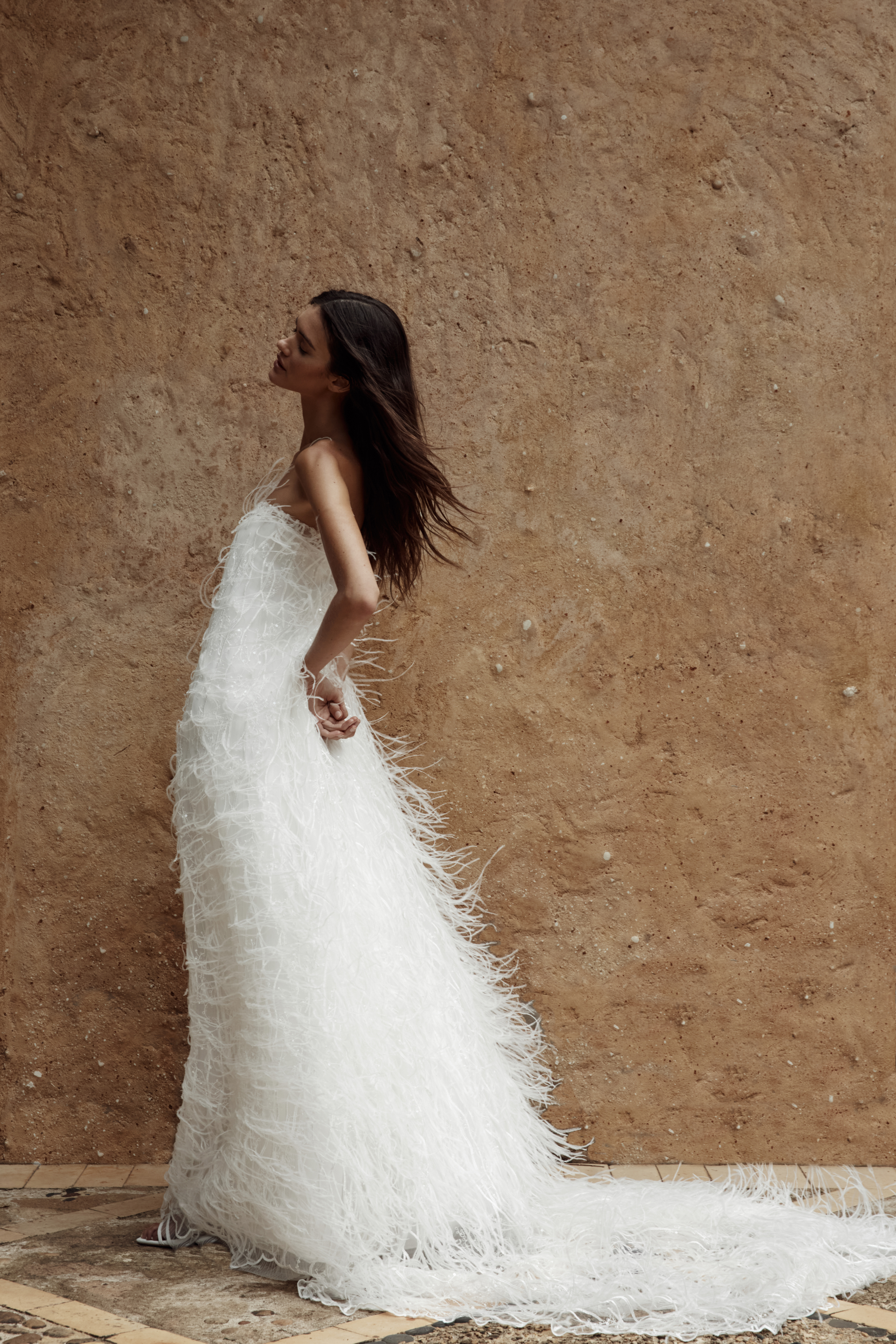 Strapless A-line gown with large train through the centre back. Equal parts elegance & drama crafted from a textured feather tulle giving it a sense of fluidity in movement.