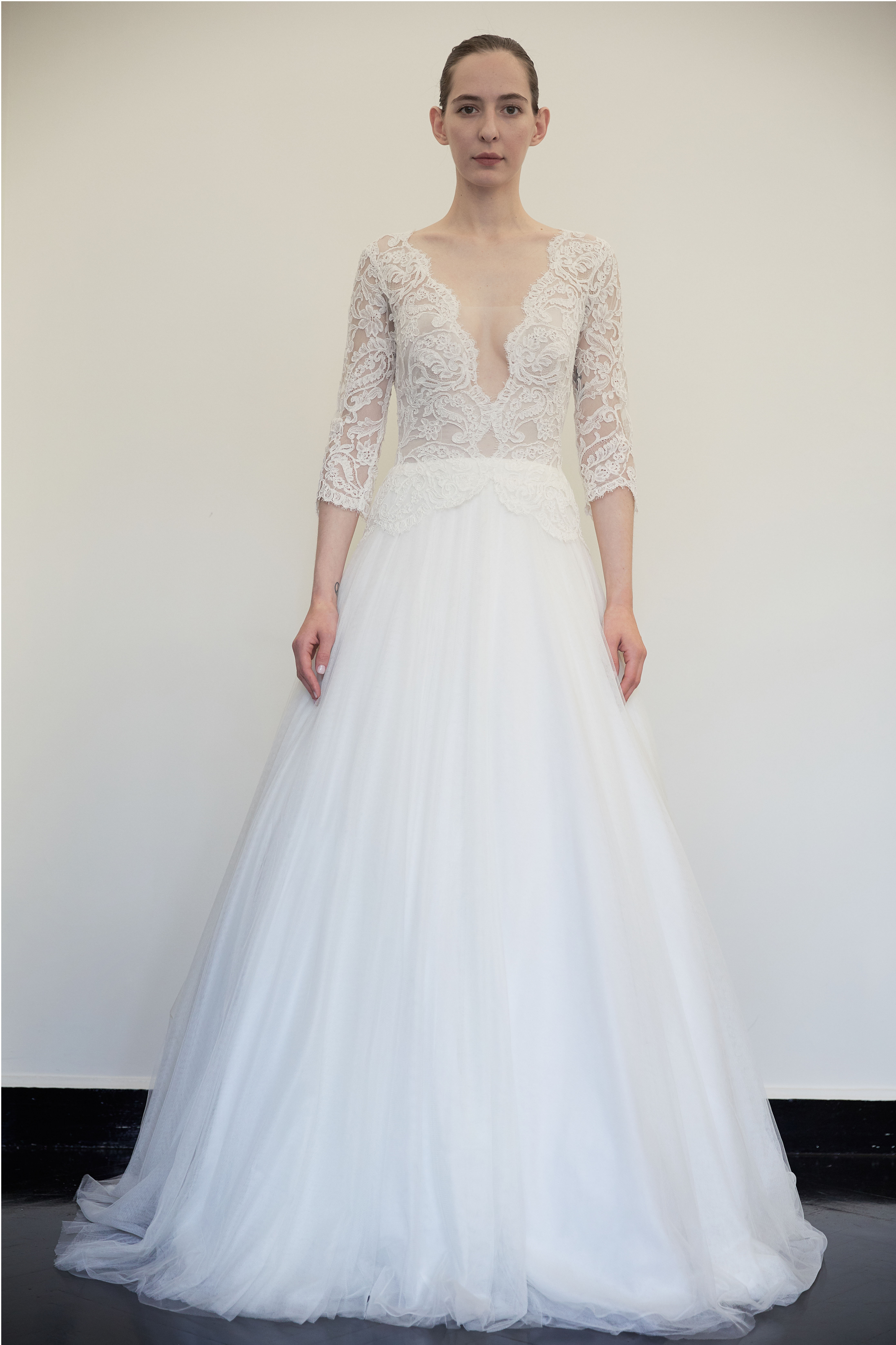 Regal & refined, this ball-gown’s voluminous silhouette is tempered by a form-fitting bodice. Crafted from Cordoné Lace, the bodice is scalloped along all its edges, creating a plunging v-neckline which is also mirrored on the back of the gown and finished with covered buttons. The bodice’s flounce detail gives way to layers of billowing French tulle, gathering in the back to form a court-length train.