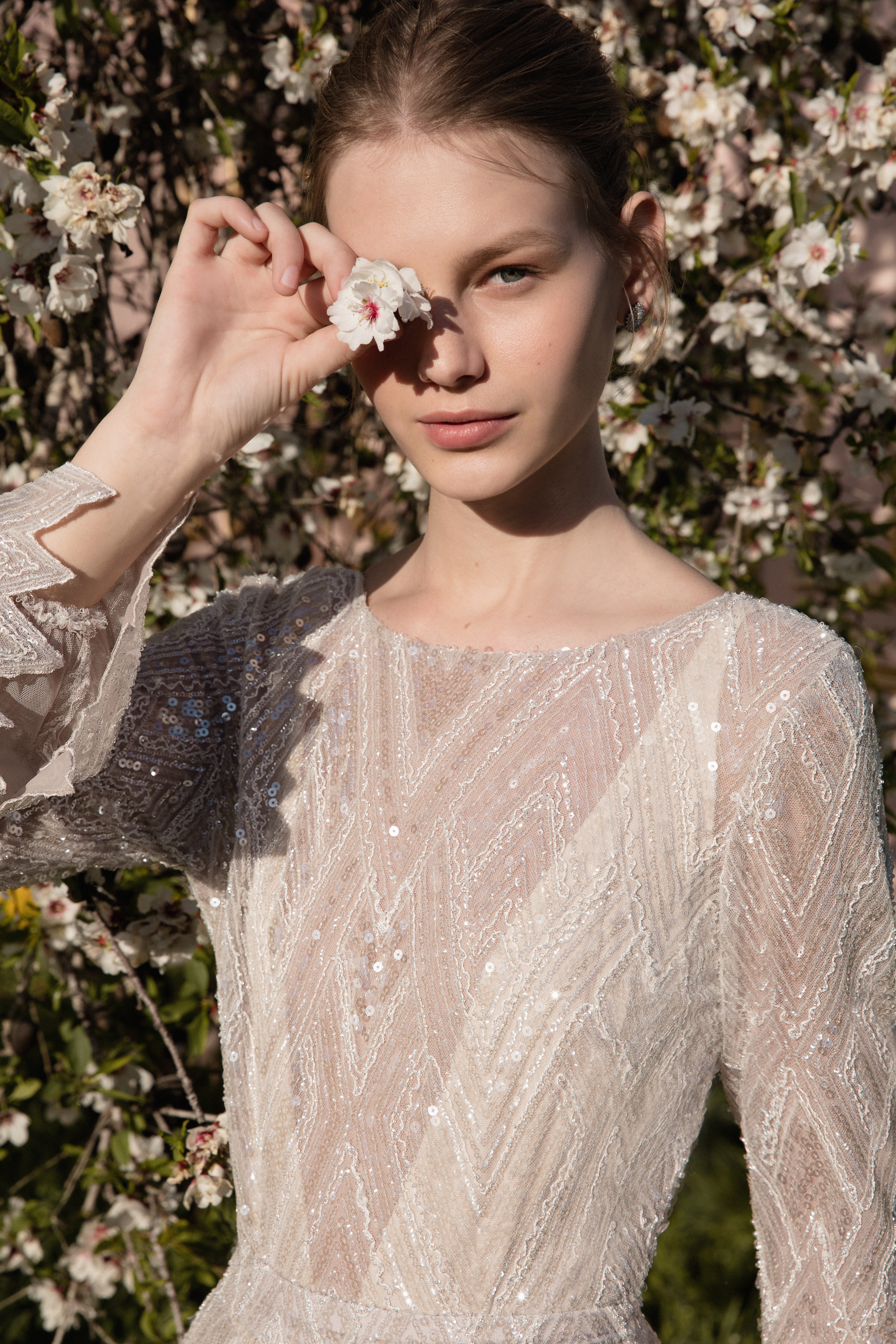 DRESS EMBELLISHMENT EMBROIDERED OFF WHITE HIGH-NECK