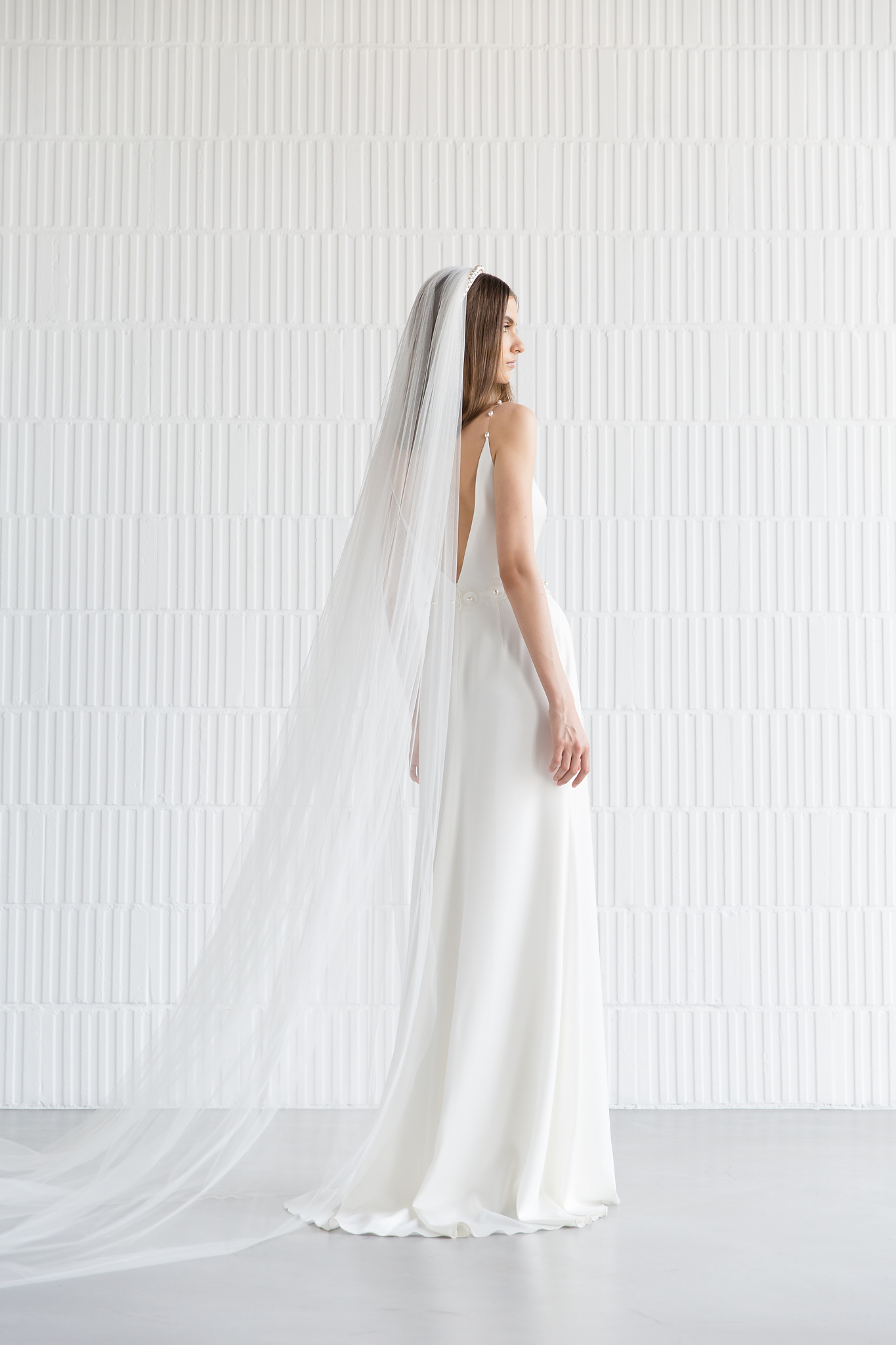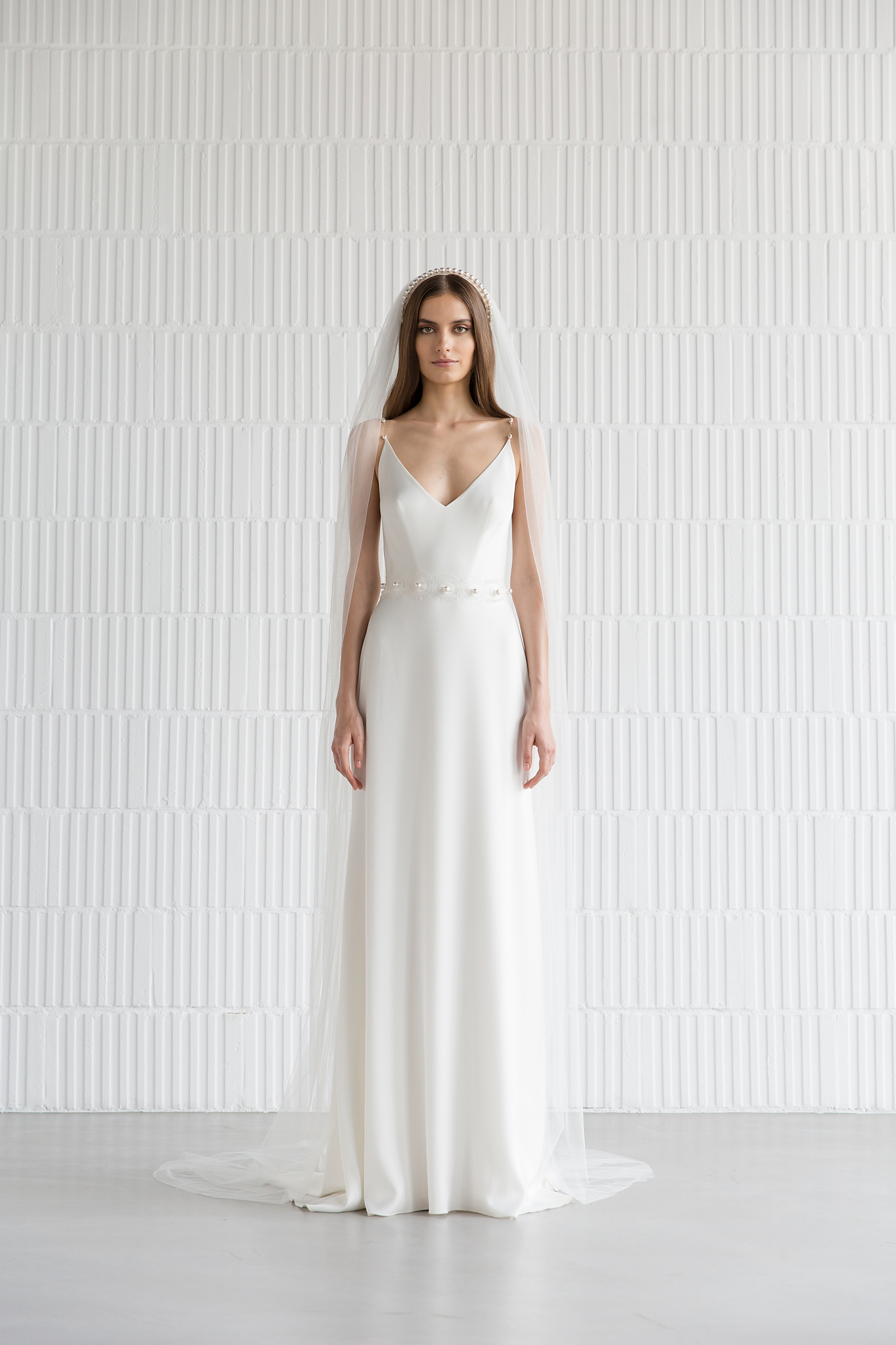 THE FRESH SIMPLICITY OF CELINE IS THE EMBODIMENT OF CONTEMPORARY. A MINIMALIST SILK DRESS, SIMPLE, BUT WITH DISTINCTIVE DETAILS, CELINE HAS A FITTED SILHOUETTE, ACCENTUATED BY THE DETACHABLE WAISTBAND MADE OF LACE AND PEARLS.