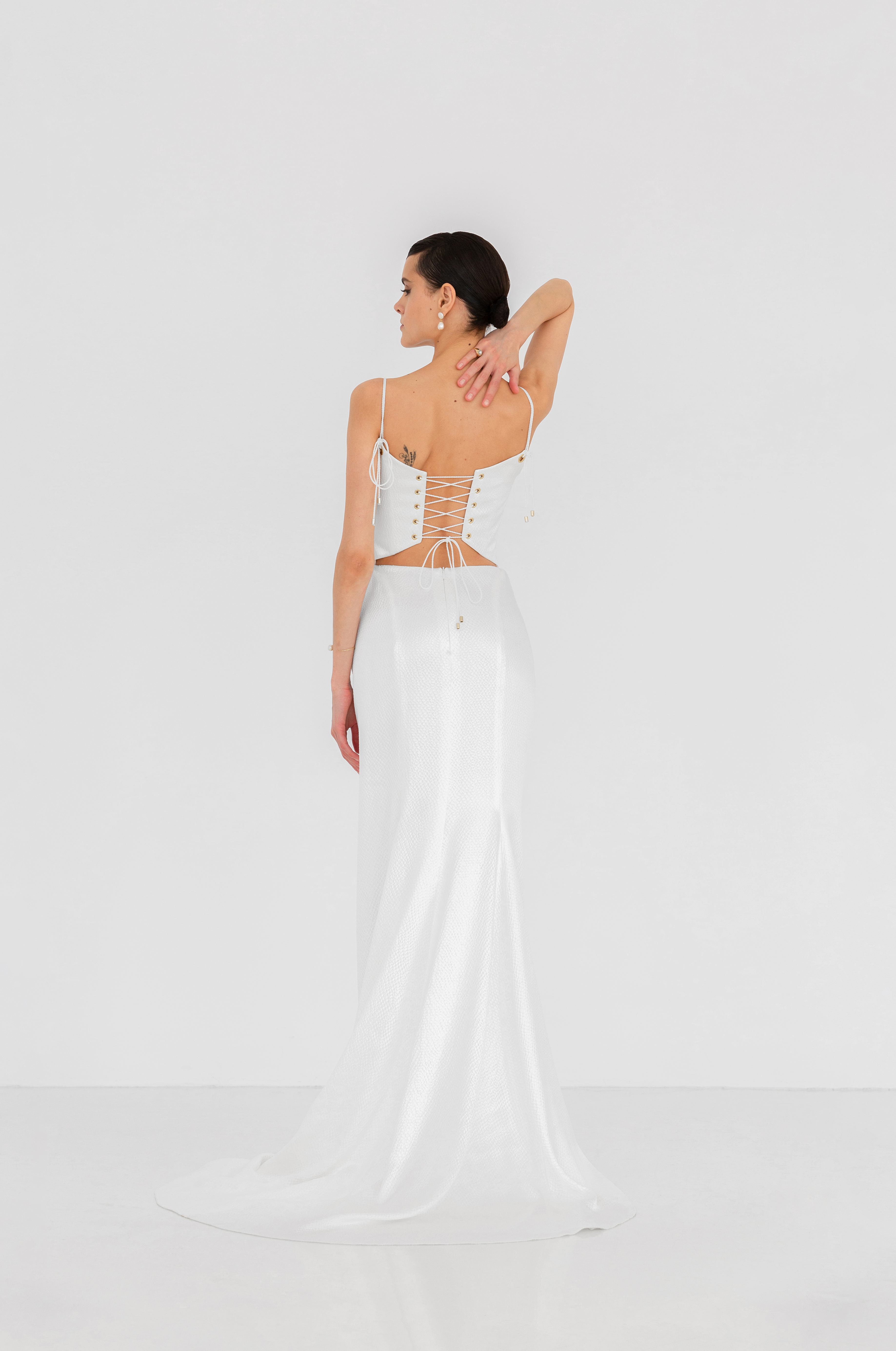WITH A DRAPED SKIRT MADE OF AMAZING, HEAVY AND SENSUOUS SILK WITH ADJUSTABLE BODICE OF GEOMETRIC DETAILS AND FINE ACCESSORIES, PIPPA IS THE DRESS OF AN URBAN DIVA, A STATEMENT PIECE YOU FALL IN LOVE WITH AT FIRST SIGHT.