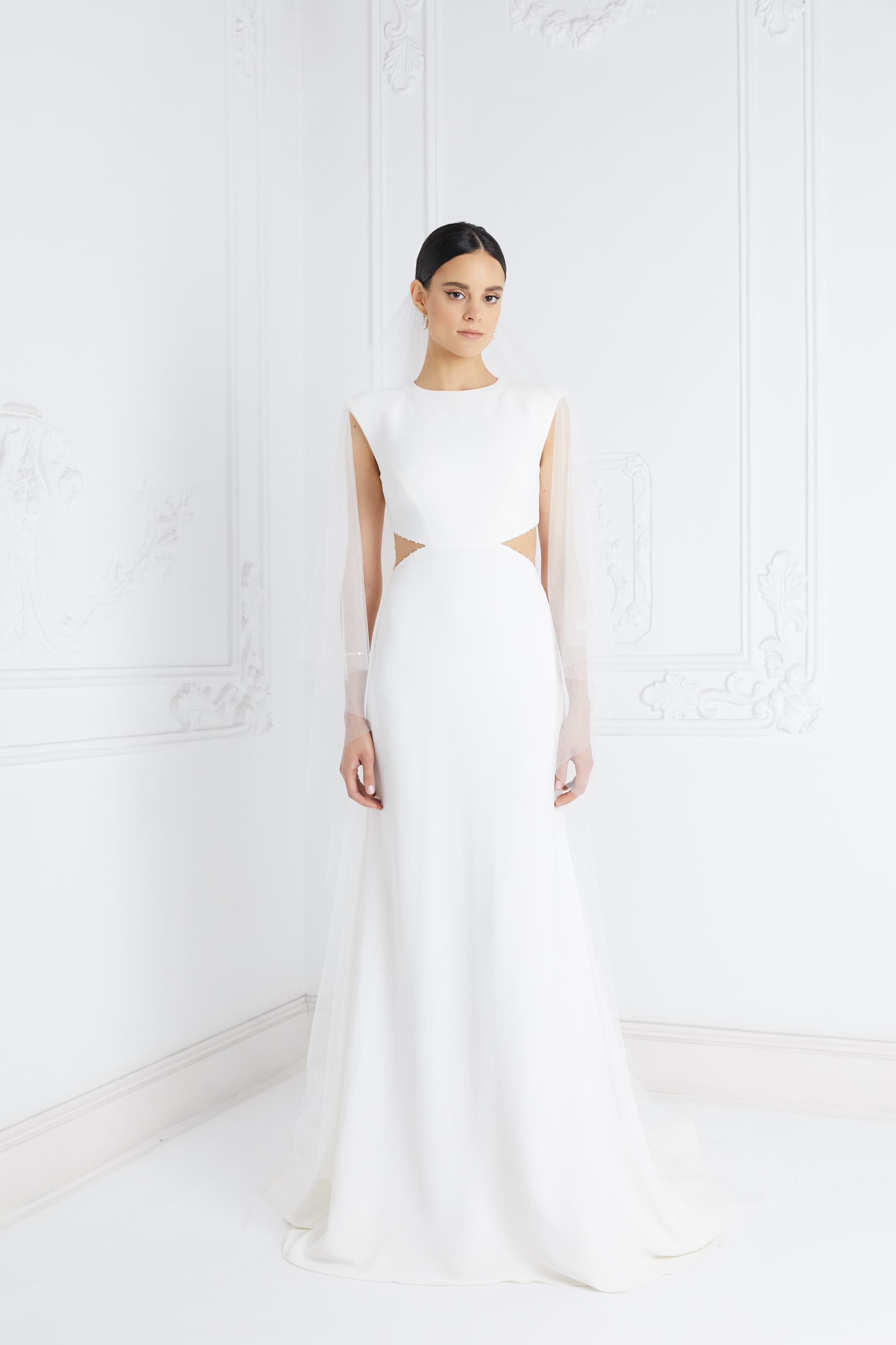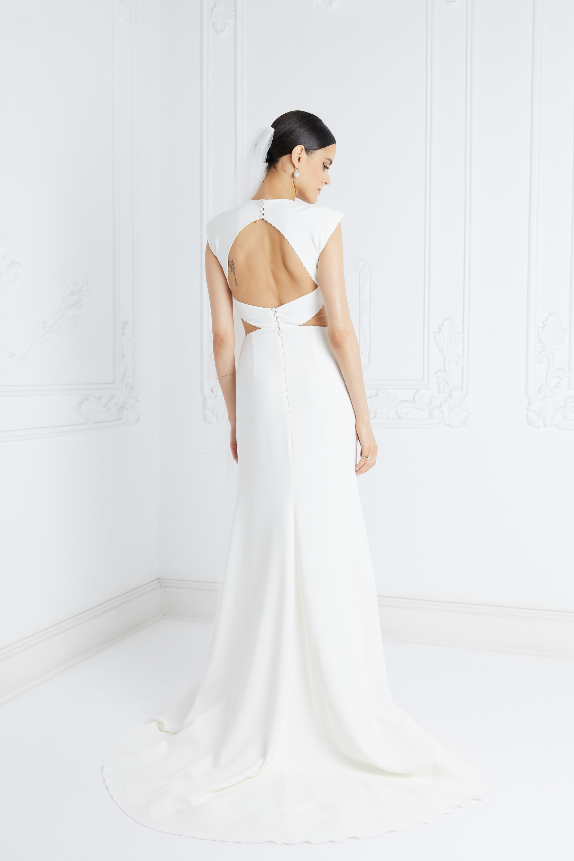The geometric inserts of the waist embracing the figure, the oversized shoulders, the sensuous and surprising back details, the fine pearl accents that edge the sumptuous imperial crepe create an impactful, clean, minimalist image. Apparently simple, yet sophisticated, the Kate wedding dress is the choice of a modern, fashion-oriented bride.
