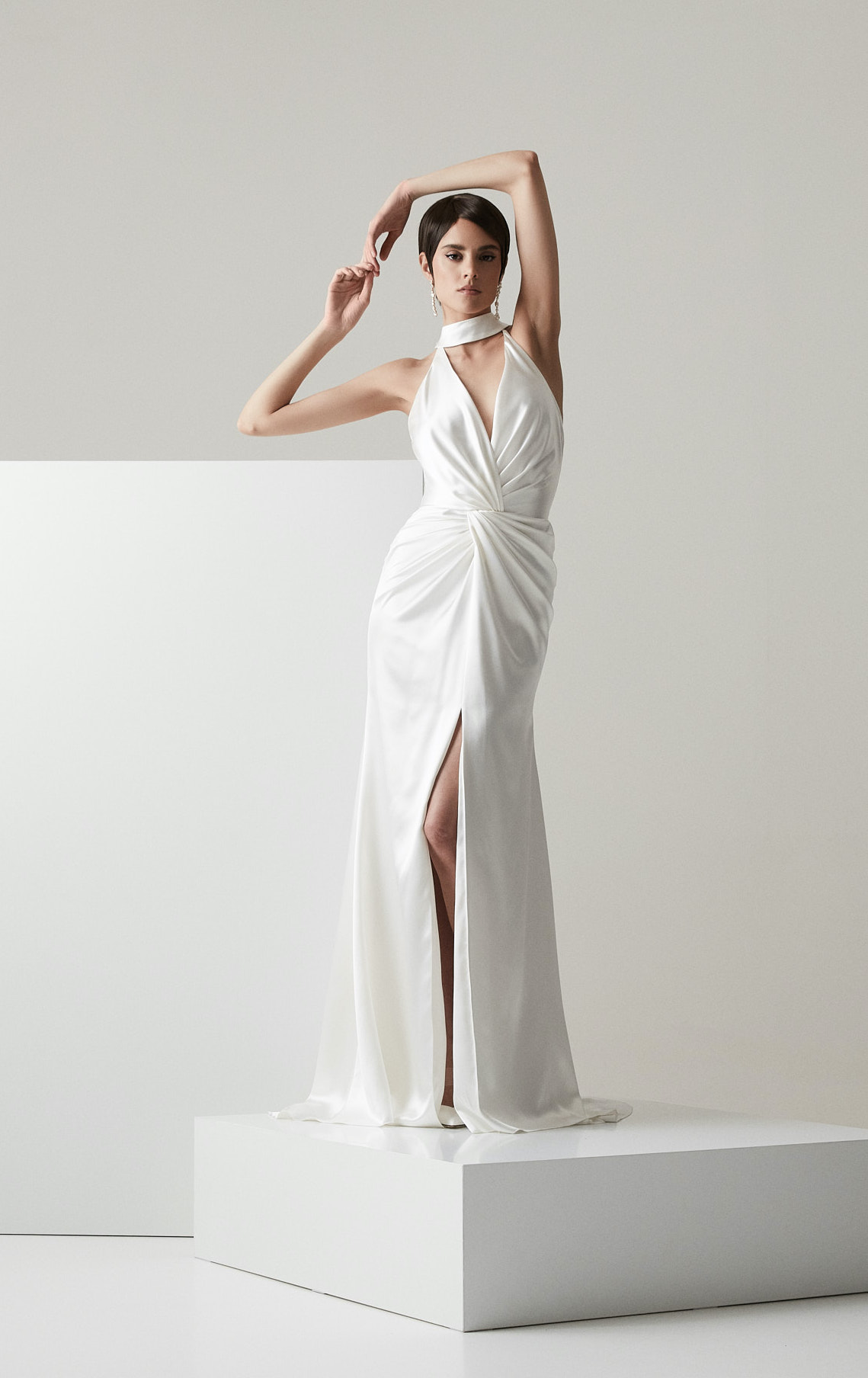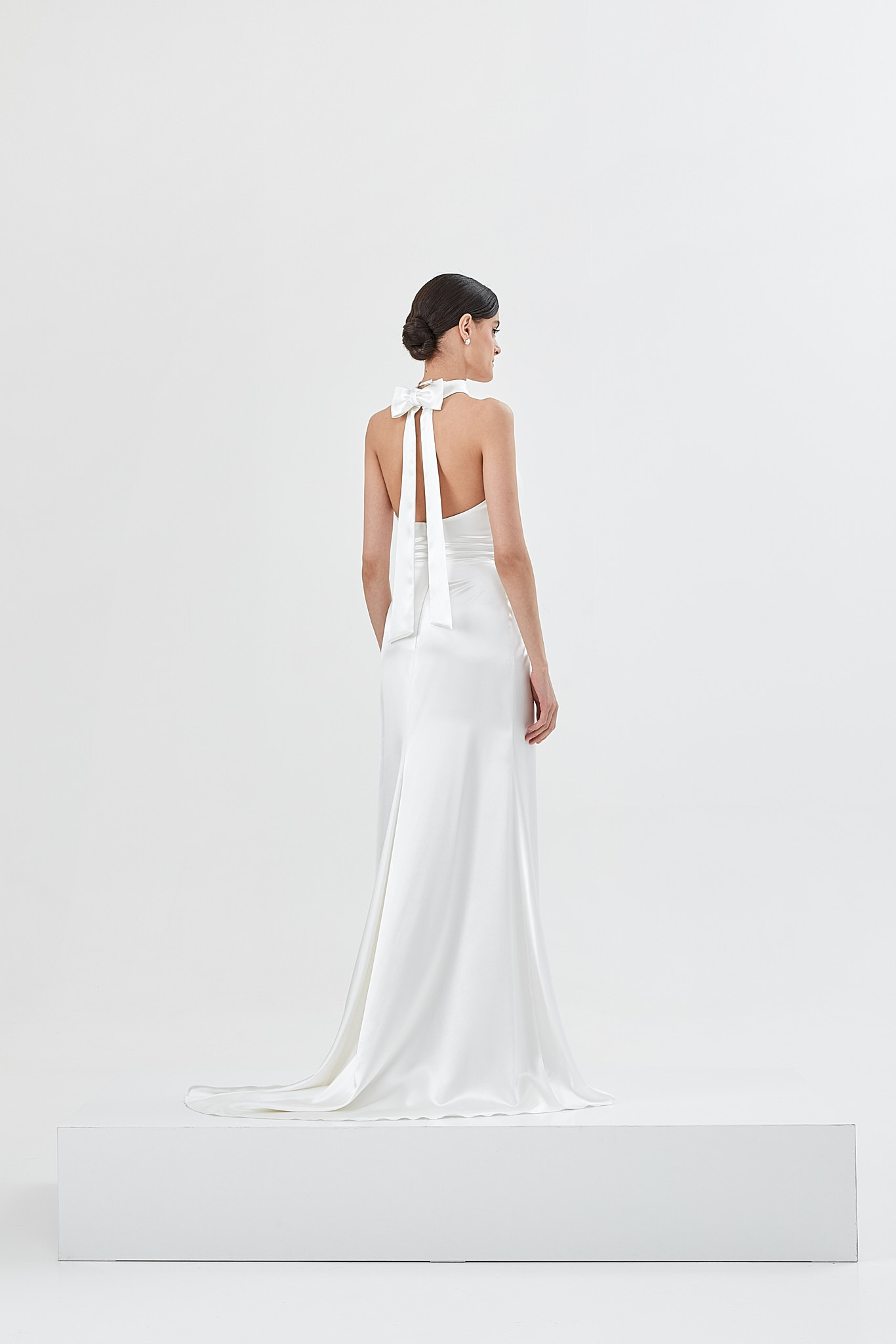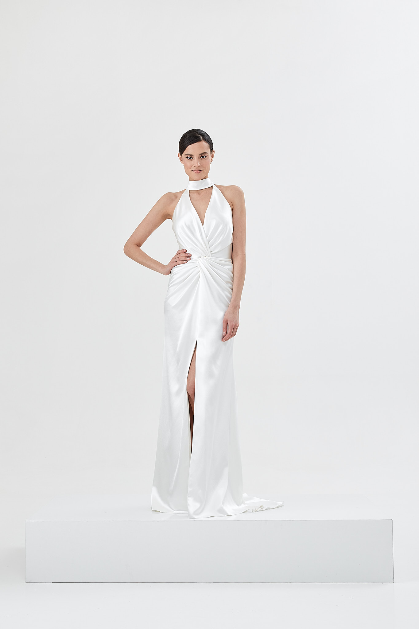 High quality silk drapes, elegantly tied together in a fashionable knot define a modern and sophisticated bridal look. The detachable neck accessory ties with a ribbon in the back that completes this sensual and refined look. June is a wedding dress suited for a bride with a relaxed, contemporary style.