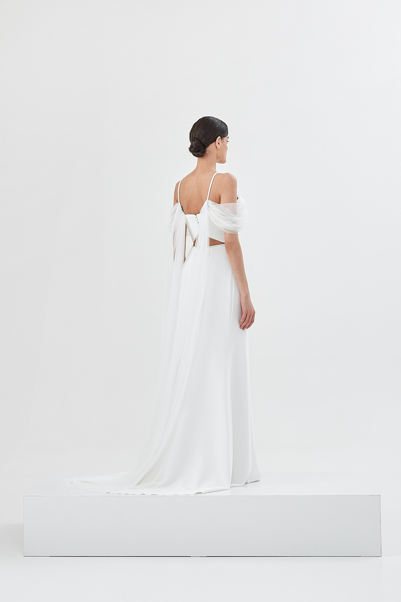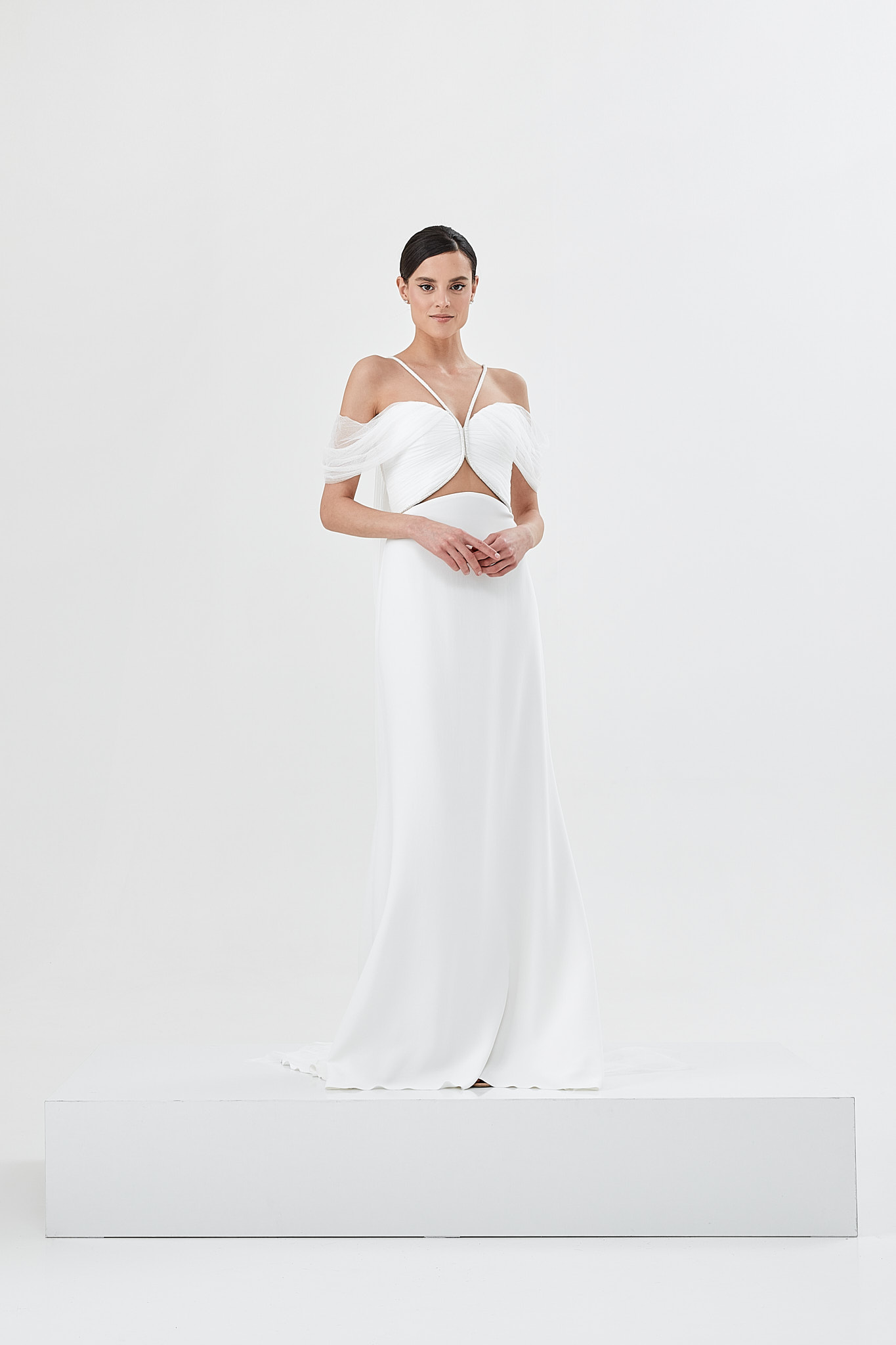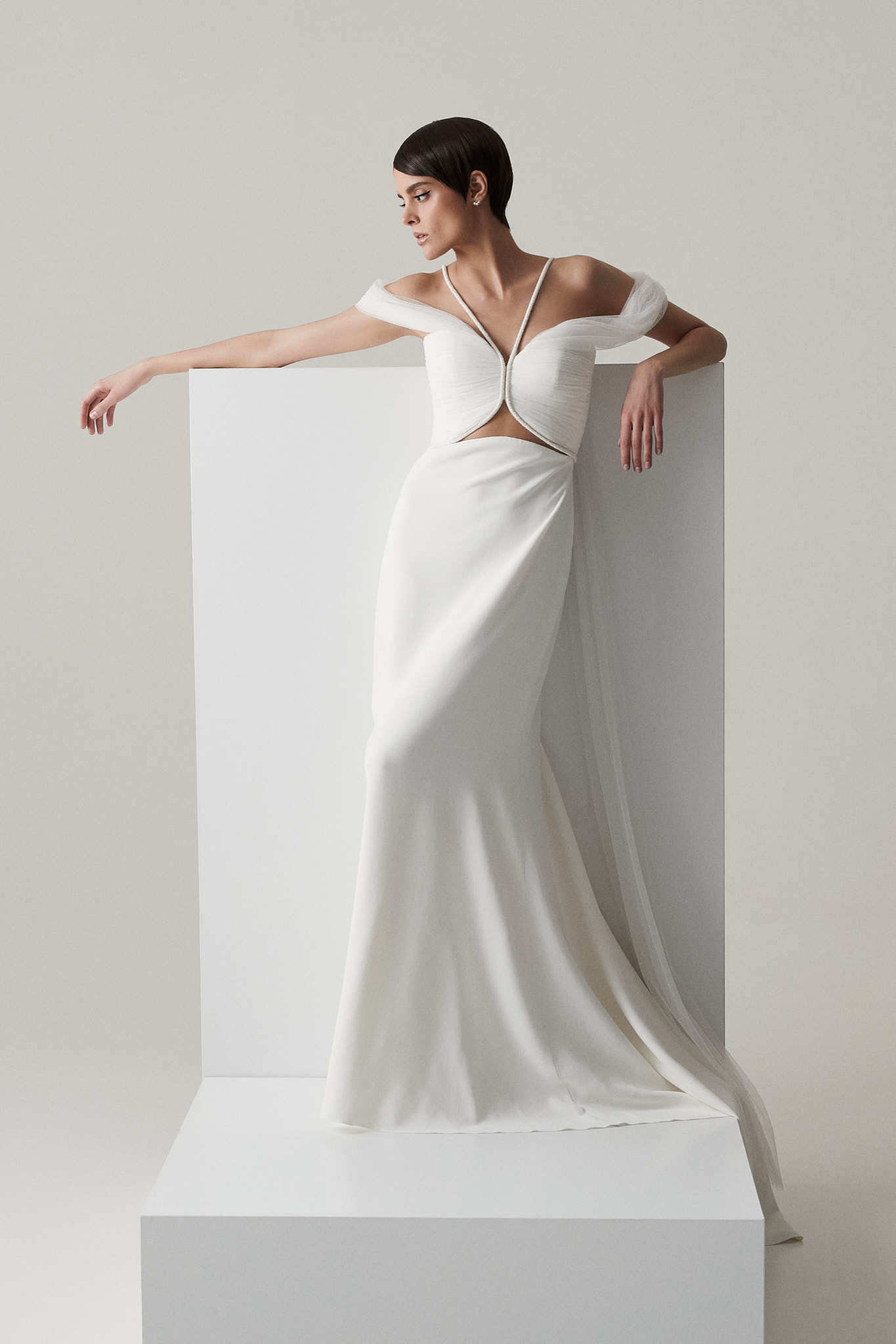 Fine lace wings, geometric sensual cuts and an elegant imperial crepe silhouette define Sienna as a refined minimalist wedding dress with a modern feel.